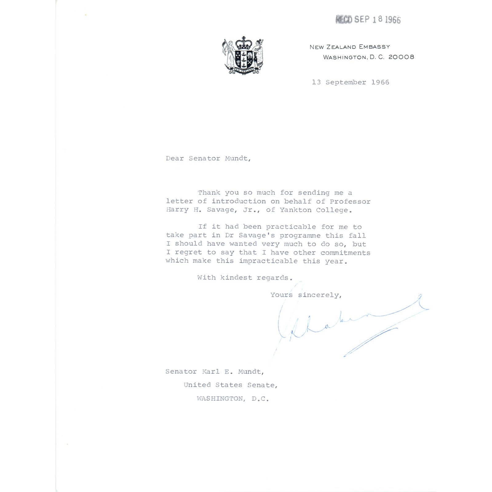 New Zealand Embassy to Senator Mundt Letterhead Memo 1966 TK1-P4
