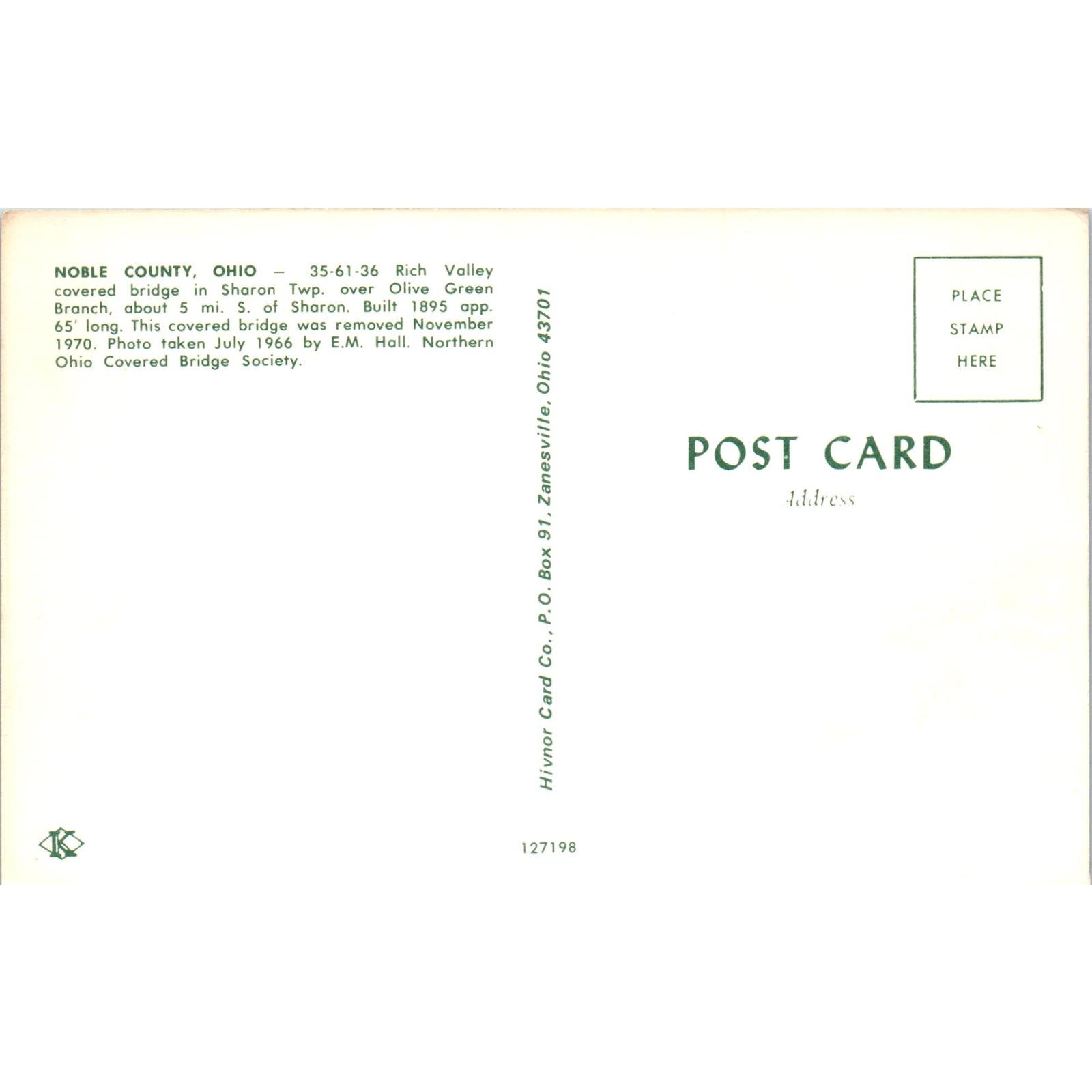 Noble County Sharon Twp Olive Green Branch Ohio Covered Bridge Postcard PC5