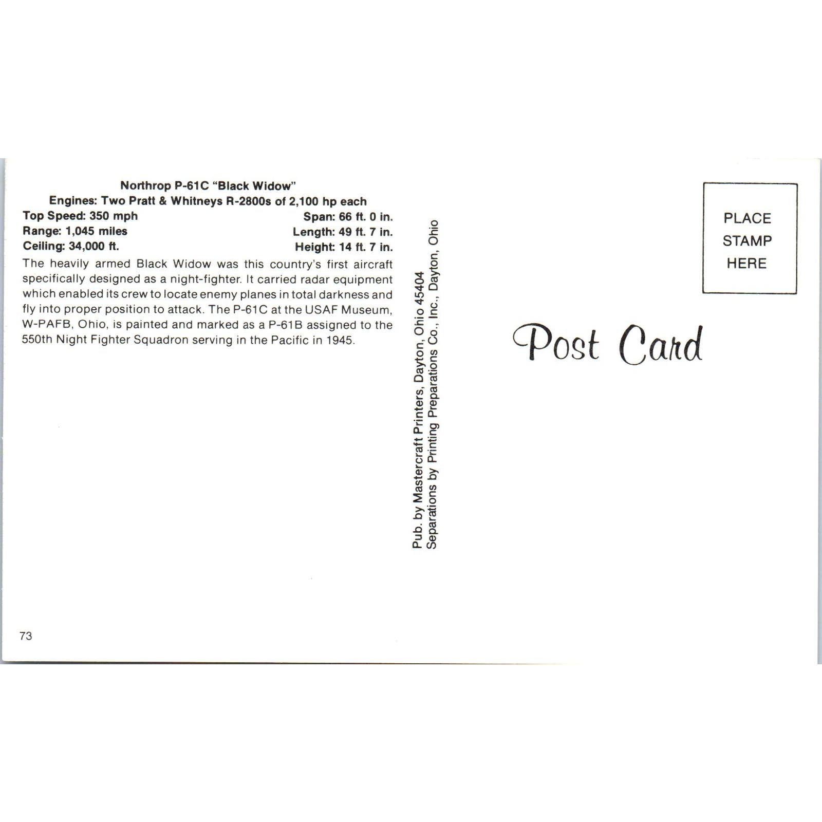 Northrop P-61C Black Widow Vintage Postcard TG8-PC