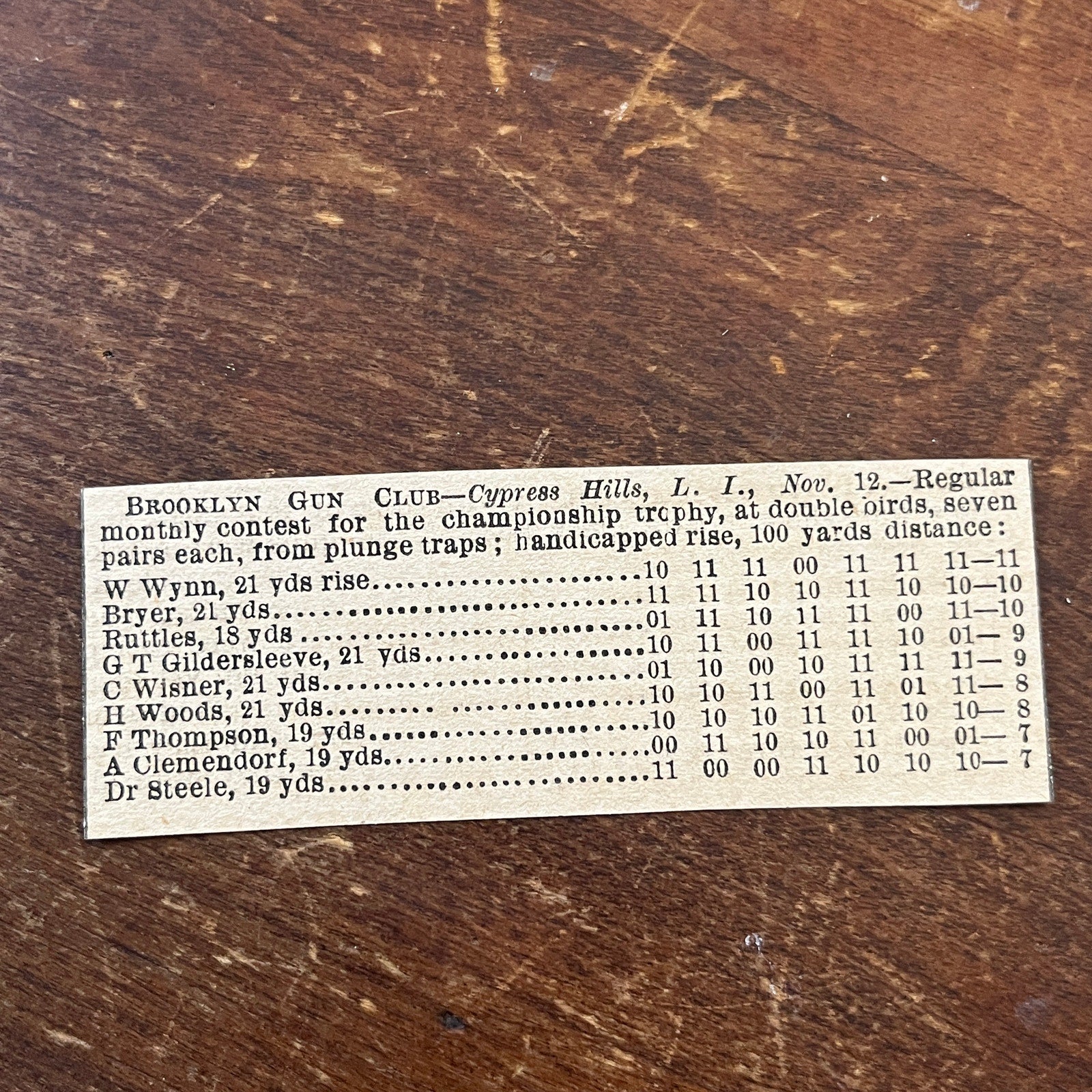 Nov 1878 Brooklyn Gun Club Cypress Hills Pigeon Match W. Wynn 1878 Clip AG2-S18