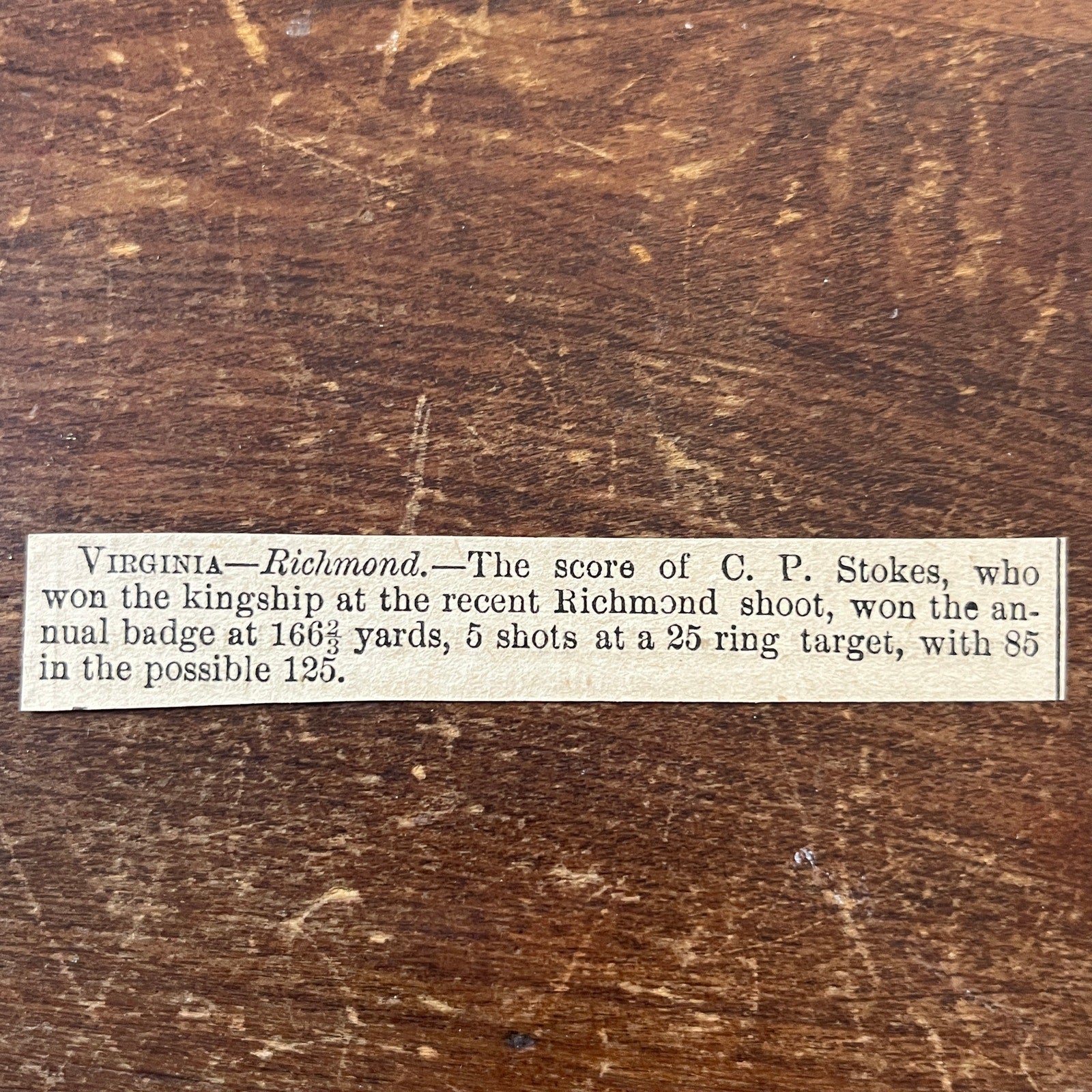 Nov 1878 C.P. Stokes Richmond Shoot Rifle Club Kingship Winner 1878 Clip AG2-S17