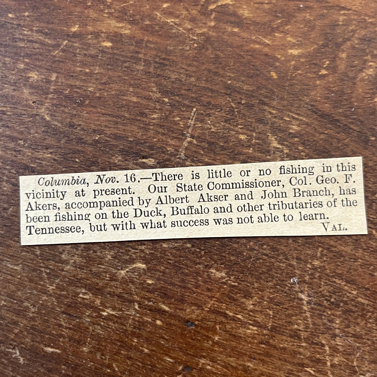 Nov 1878 Columbia TN Fishing Report Col Geo F Akers 1878 Clip AG2-S17
