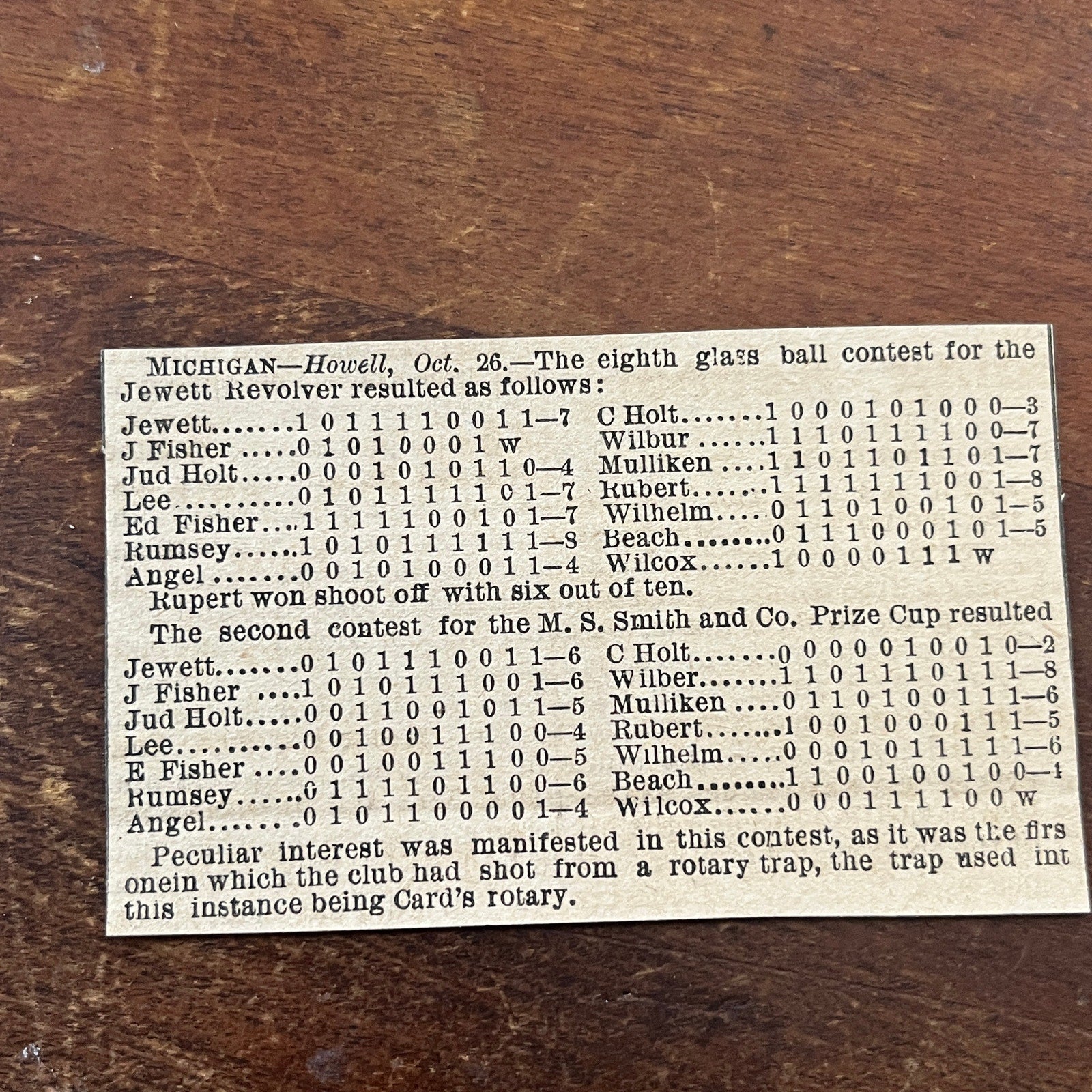 Nov 1878 Pigeon Matches Howell MI Jewett, J. Fisher 1878 Clip AG2-S18