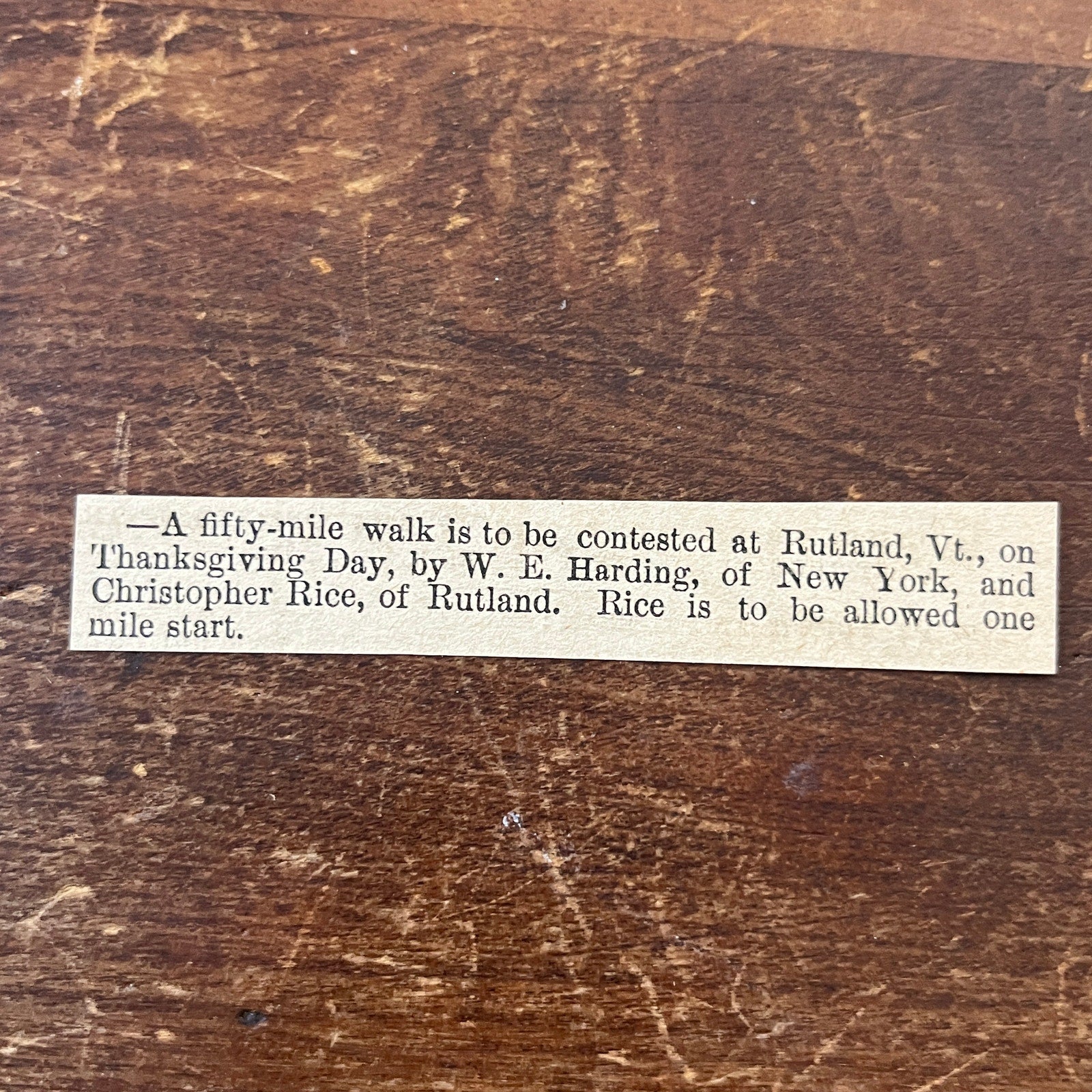Nov 1878 W.E. Harding, Christopher Rice Rutland VT 50 Mile Walk 1878 Clip AG2-S17