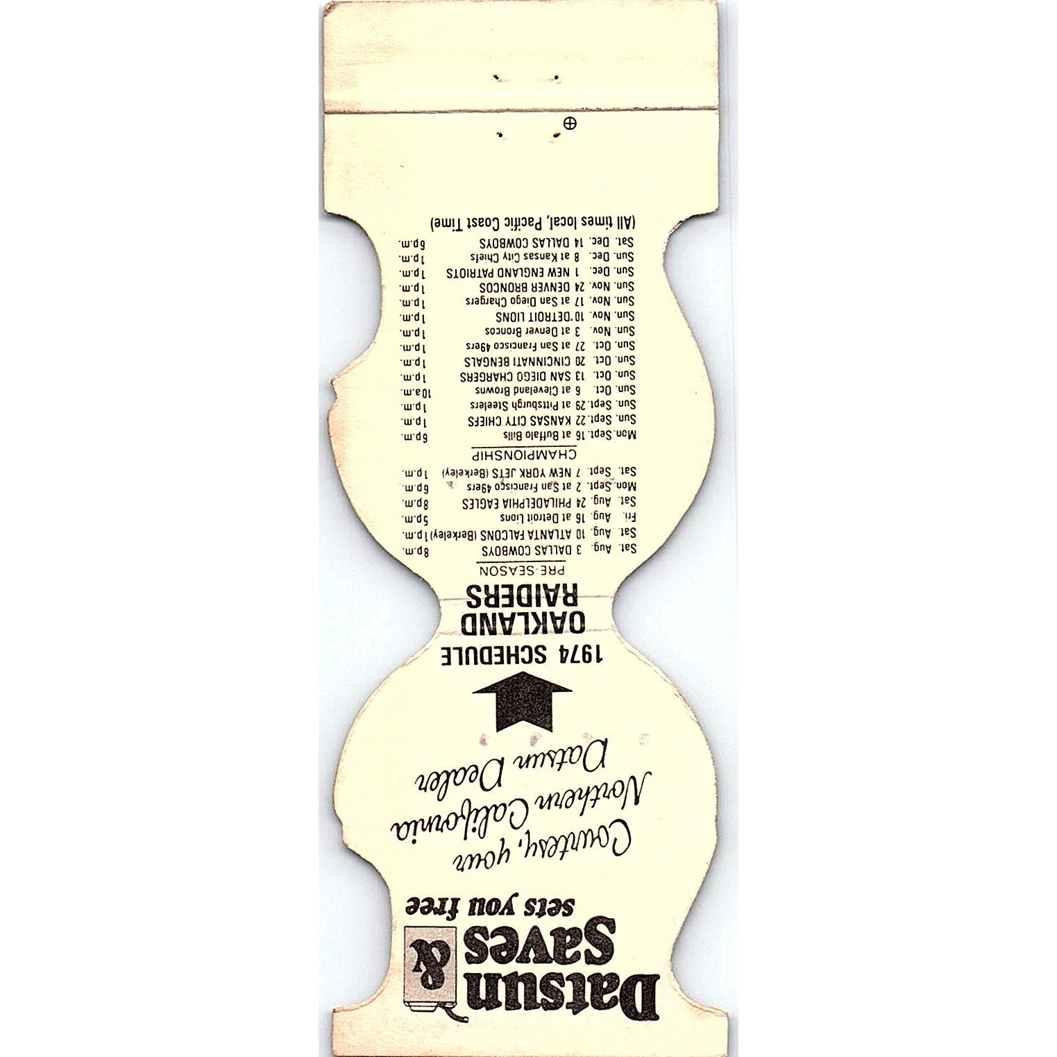 Oakland Raiders 1974 Schedule Datsun Saves Vintage Matchbook TB6-MB2-7