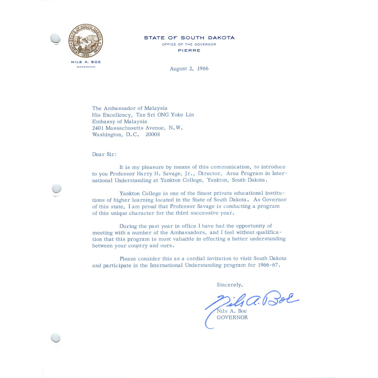Official South Dakota Governor Letterhead Signed Nils A. Boe Aug 1966 TK1-P11