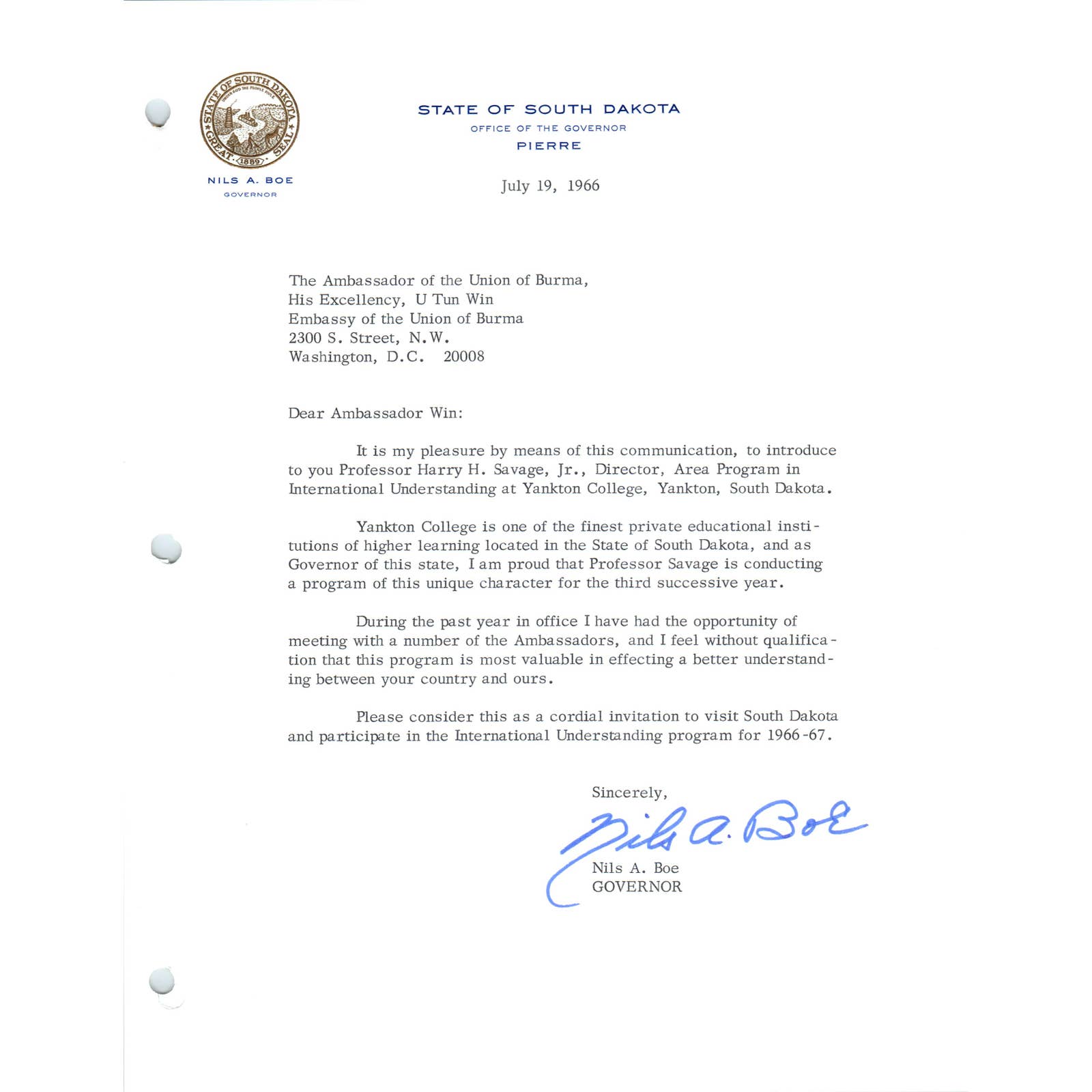 Official South Dakota Governor Letterhead Signed Nils A. Boe Jul 1966 TK1-P11