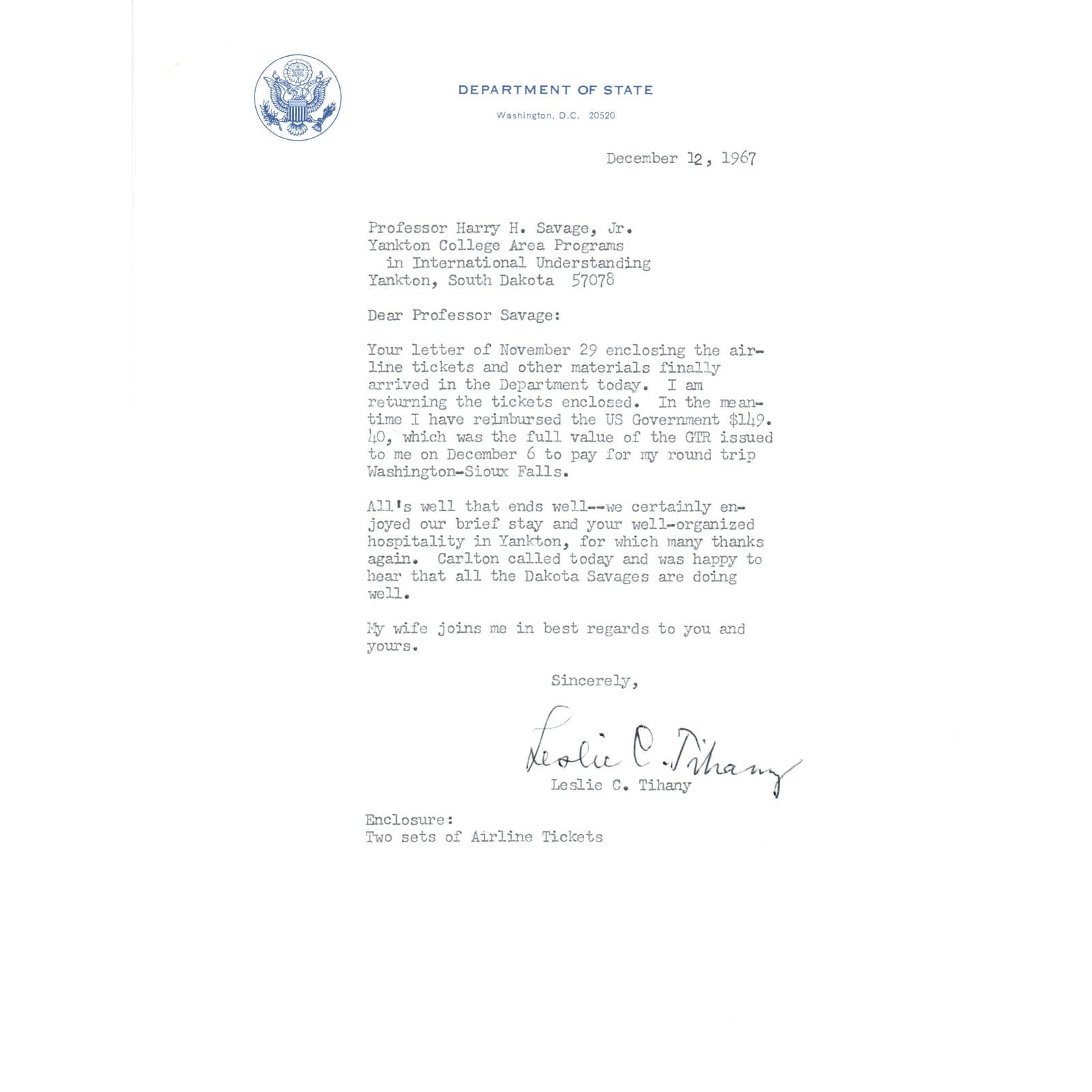 Official US Department of State Letterhead Memo Leslie C. Tihany 12/12/67 TK1-P7