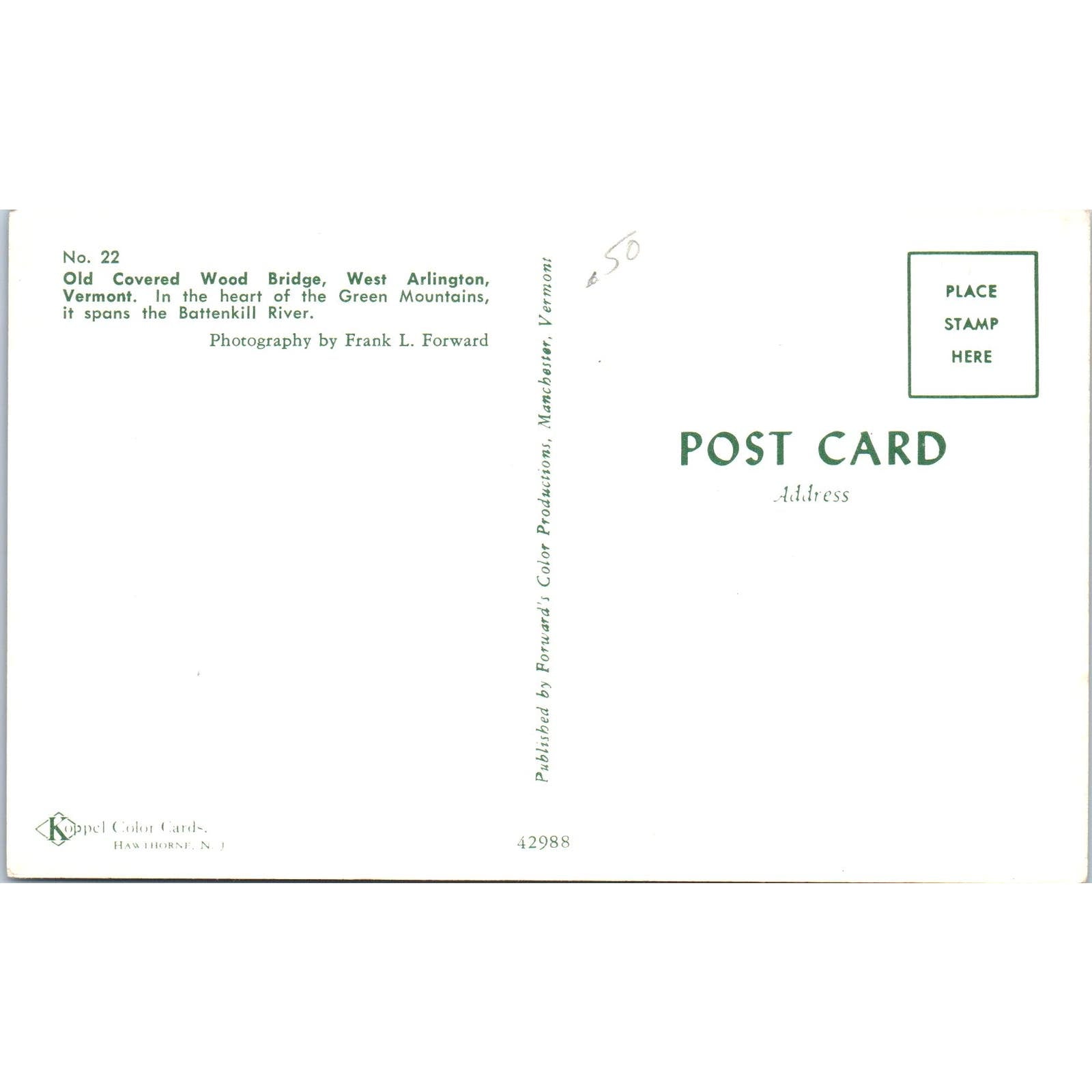 Old Covered Wood Bridge West Arlington Vermont Covered Bridge Postcard PB13