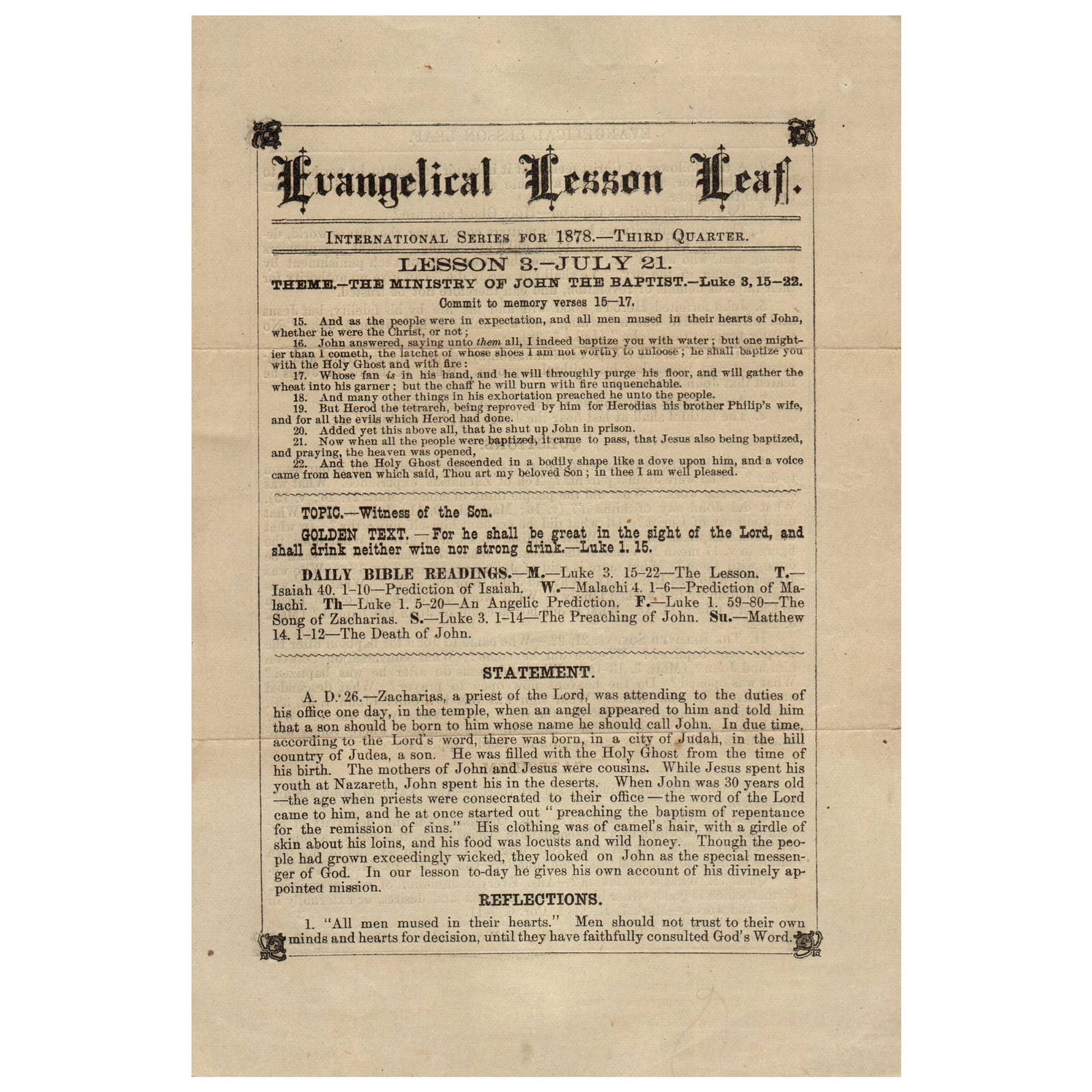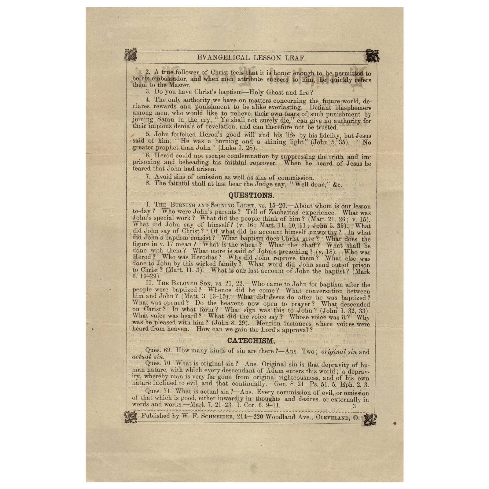 Original 1878 Evangelical Lesson Leaf W.F. Schneider Cleveland OH AD8