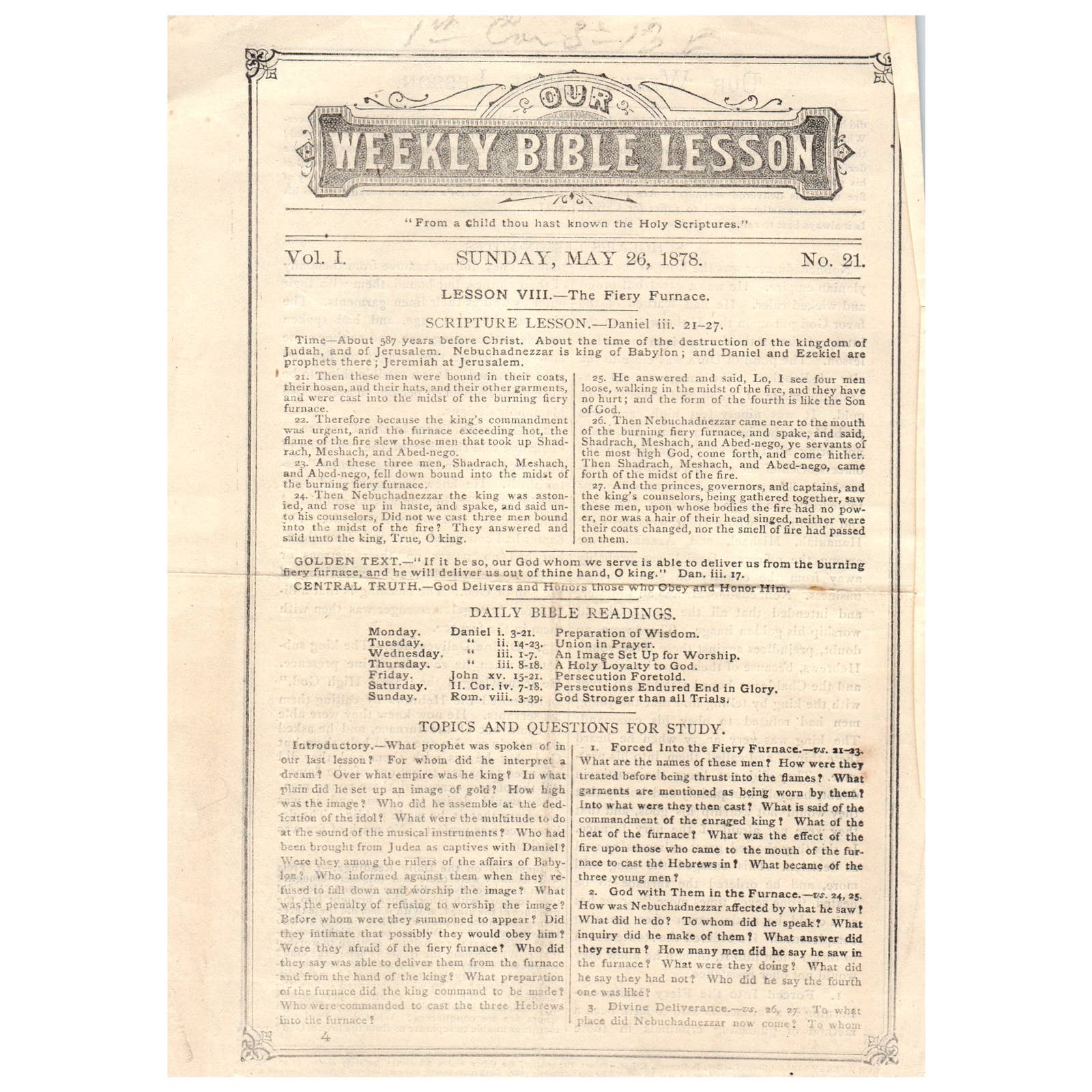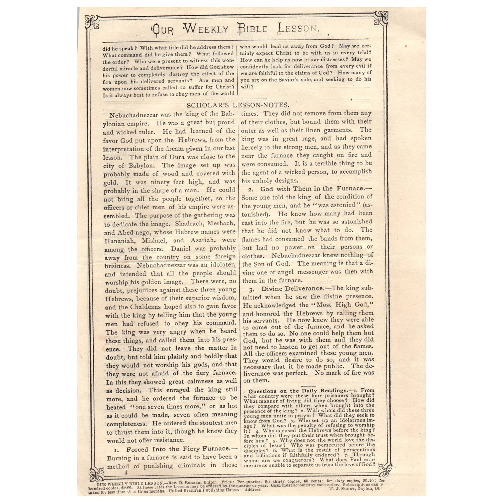 Original 1878 Weekly Bible Lesson Leaf W.J. Shuey Dayton OH Daniel iii 21-27 AD8