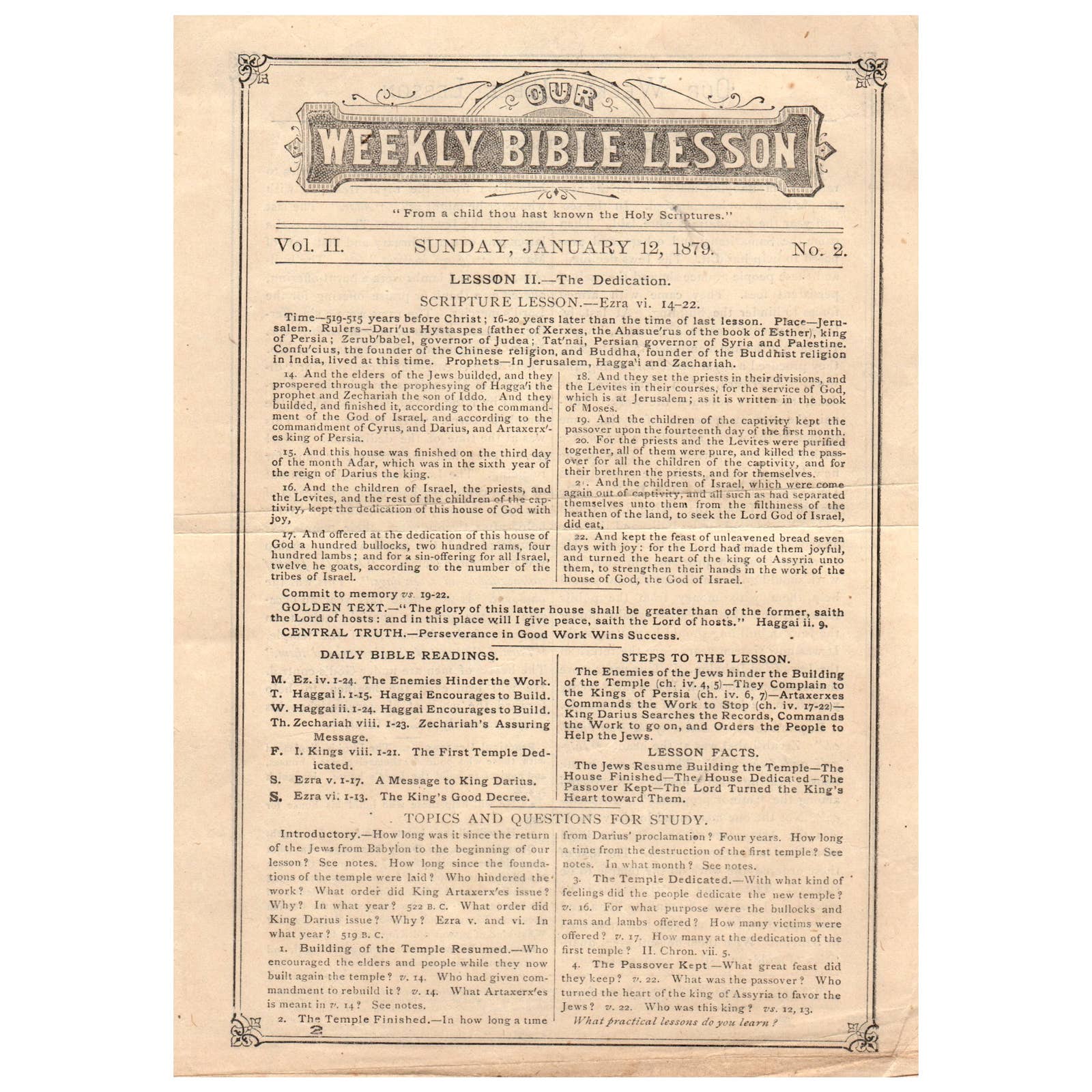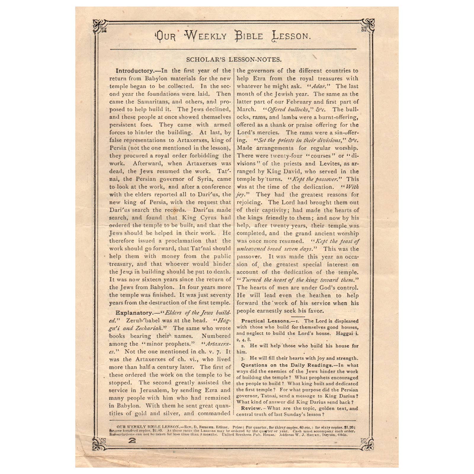 Original 1879 Weekly Bible Lesson Leaf W.J. Shuey Dayton OH Ezra vi. 14-22 AD8