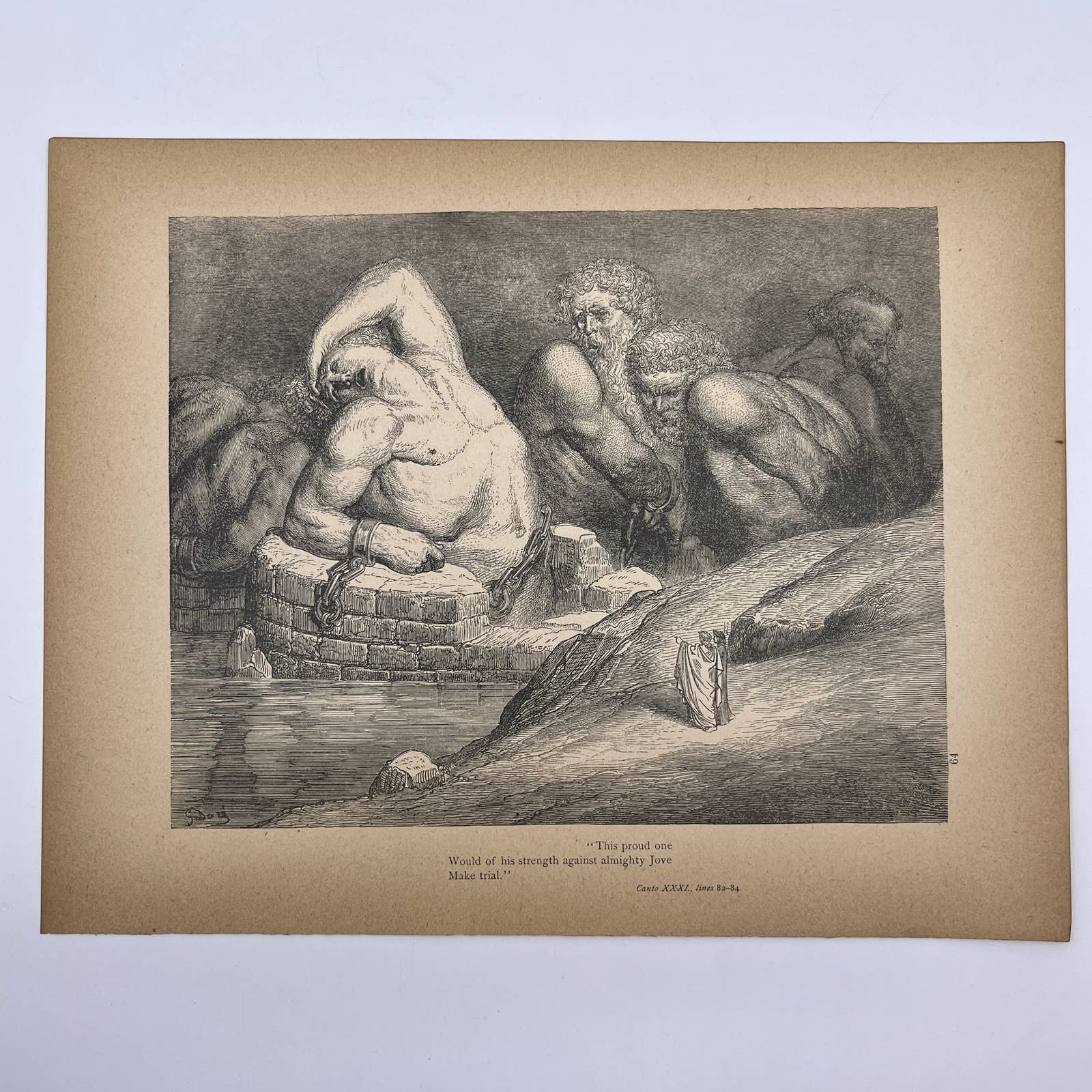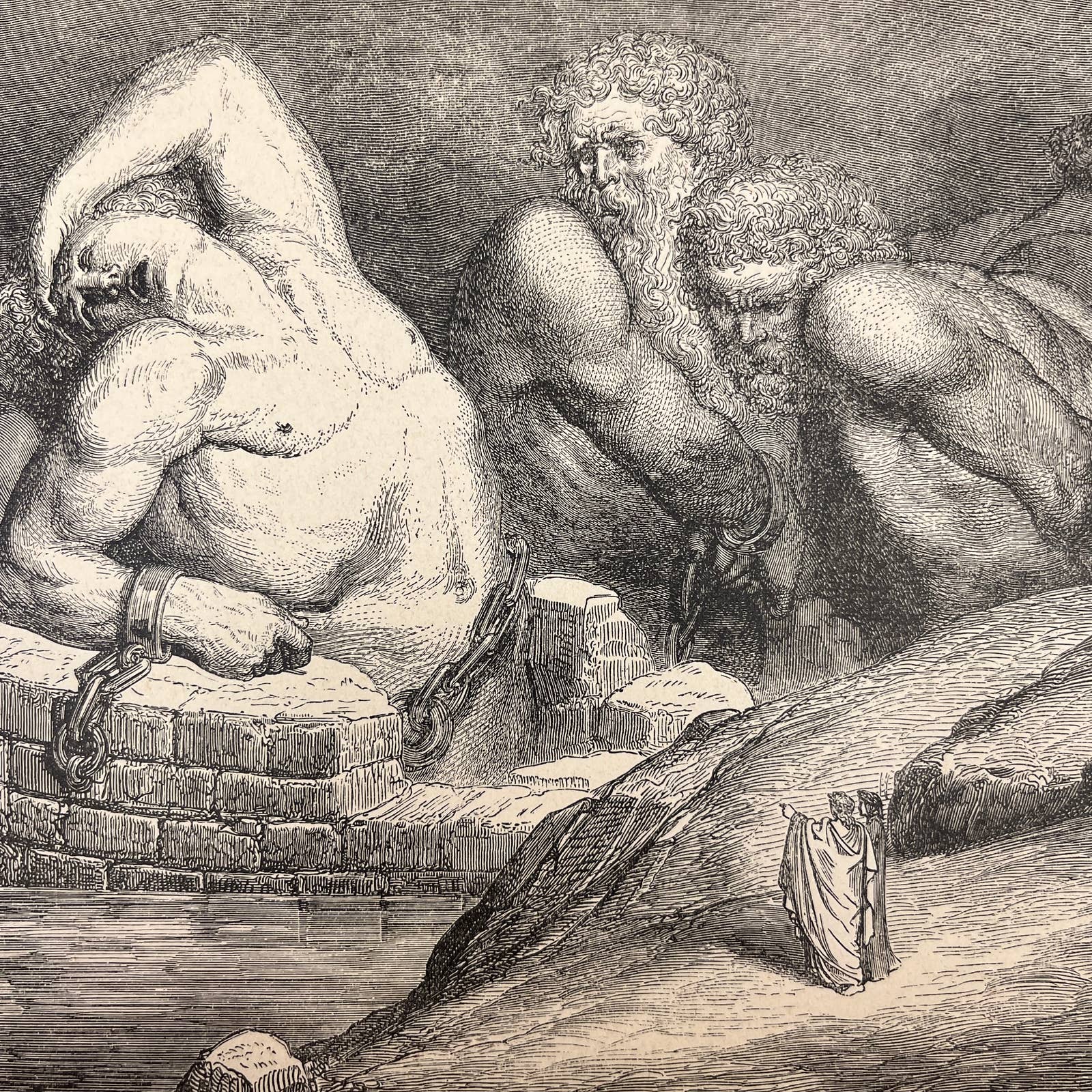 Taken from an original 1880s Divine Comedy Book of Engravings by Gustav Dore. Paper is getting brittle around the edges and may have small tearing and some spots and other signs of age, as it is near 150 years old.