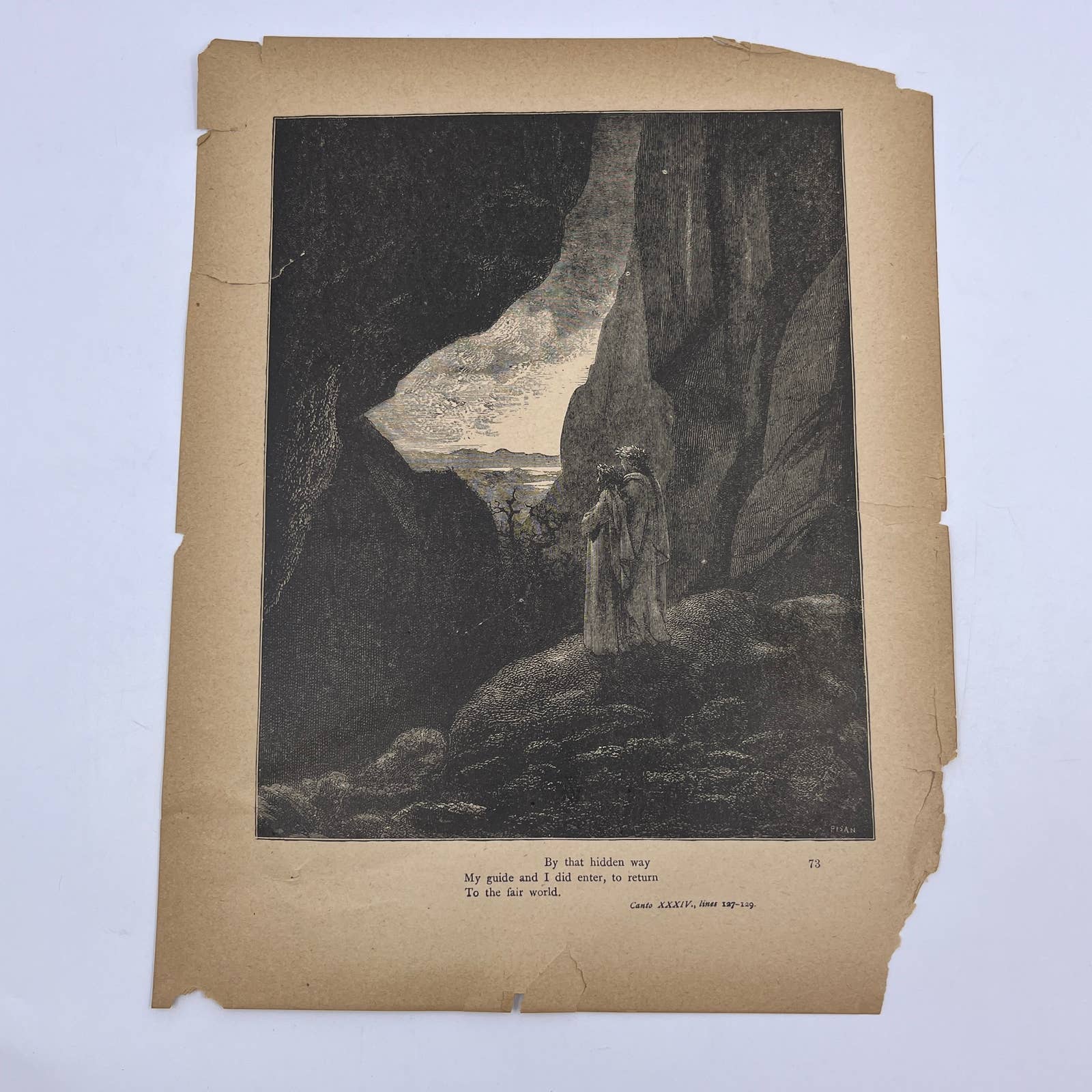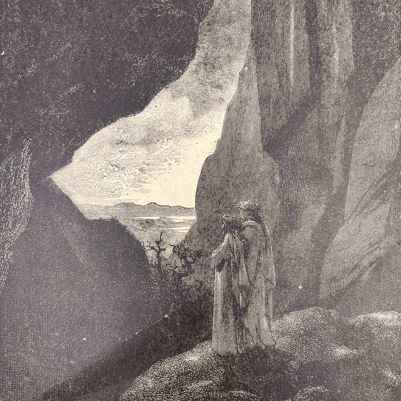 Taken from an original 1880s Divine Comedy Book of Engravings by Gustav Dore. Paper is getting brittle around the edges and may have small tearing and some spots and other signs of age, as it is near 150 years old.