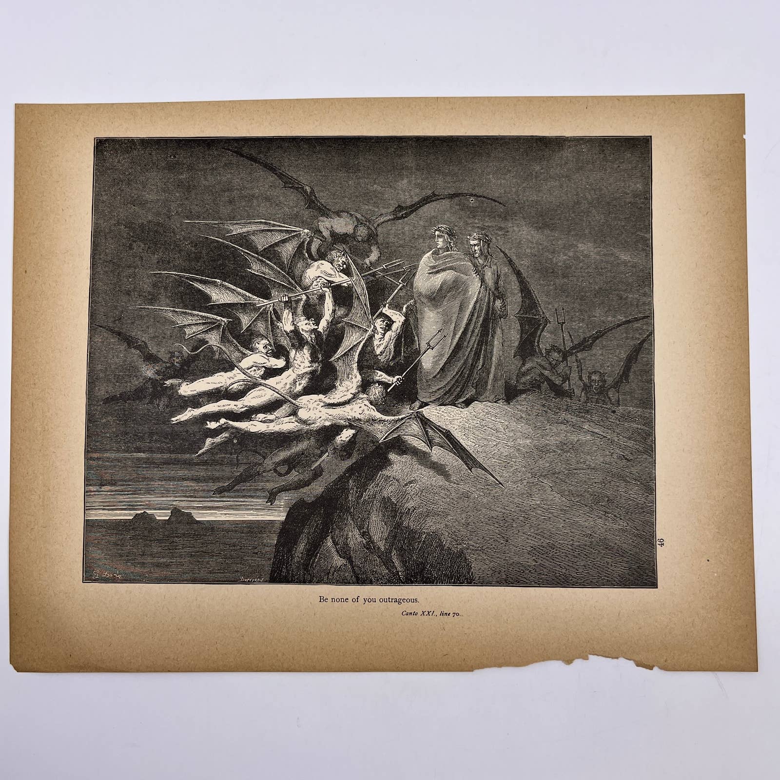 Taken from an original 1880s Divine Comedy Book of Engravings by Gustav Dore. Paper is getting brittle around the edges and may have small tearing and some spots and other signs of age, as it is near 150 years old.