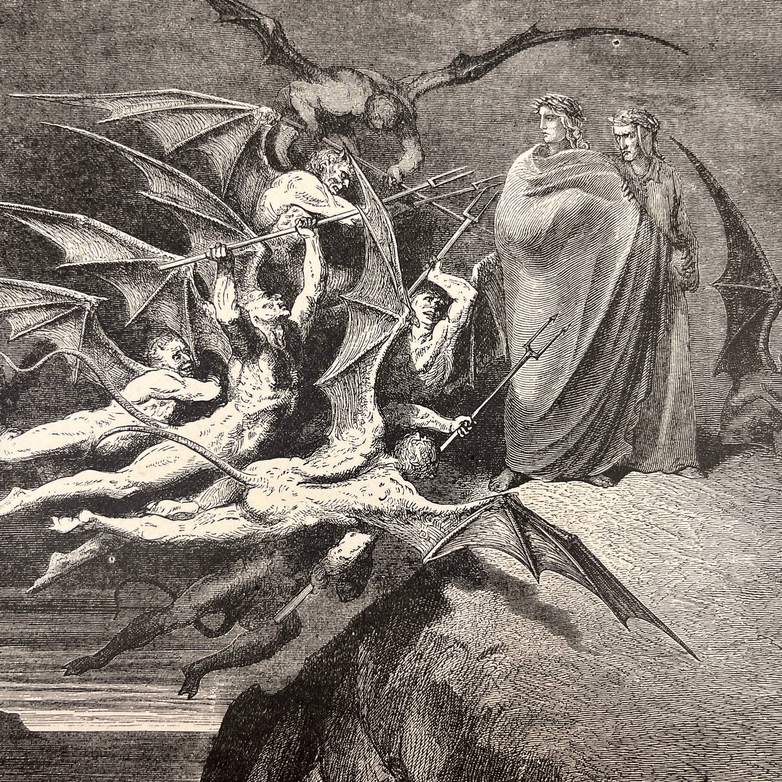 Original 1880s Gustave Dore Engraving Divine Comedy Demons Threaten Virgil FL4