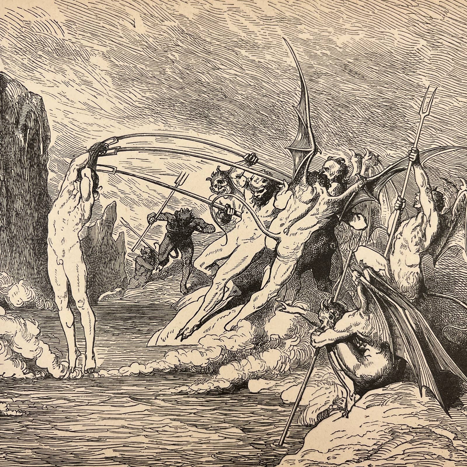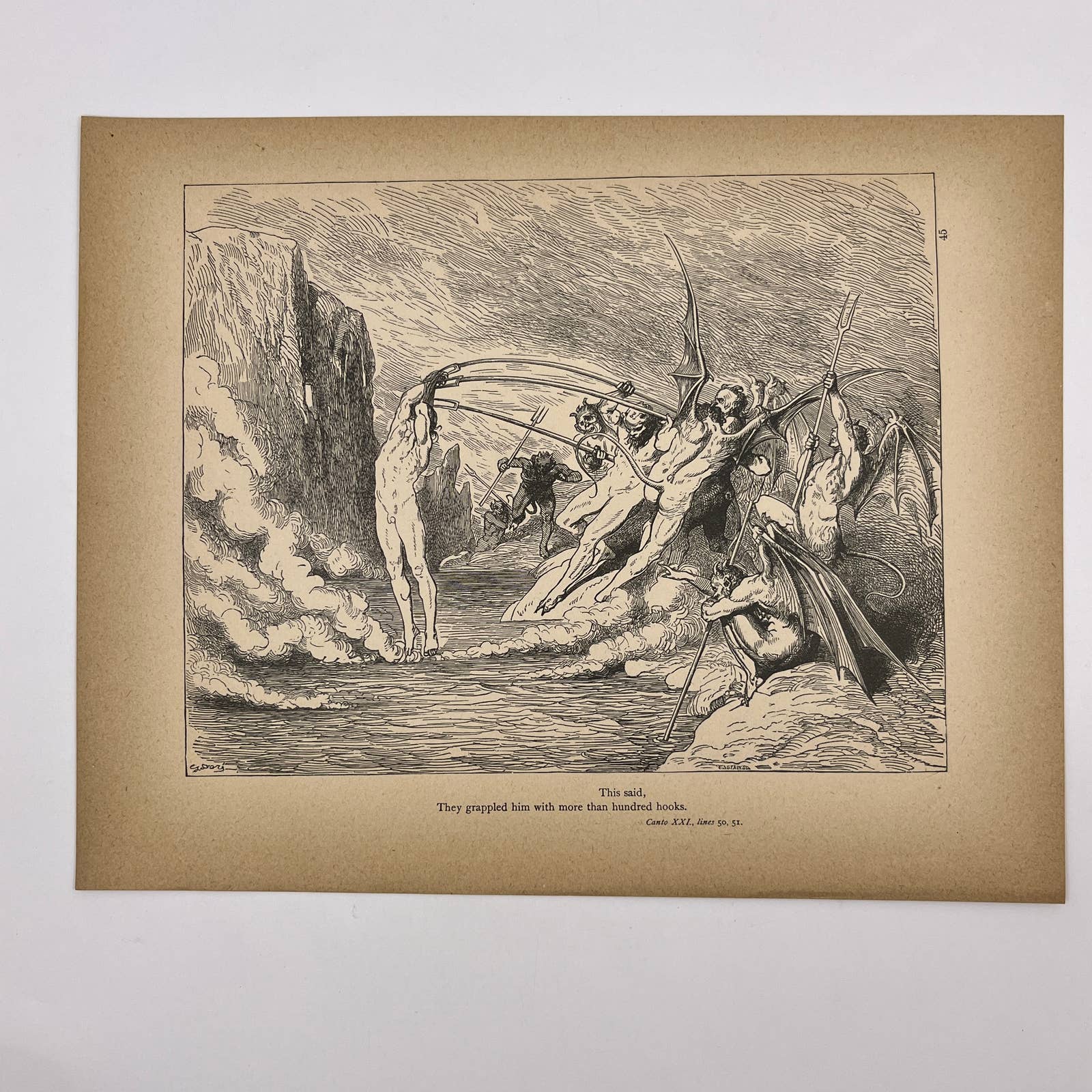 Original 1880s Gustave Dore Engraving Divine Comedy grappled by 100 hooks FL4
