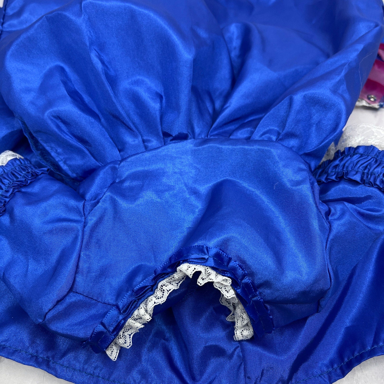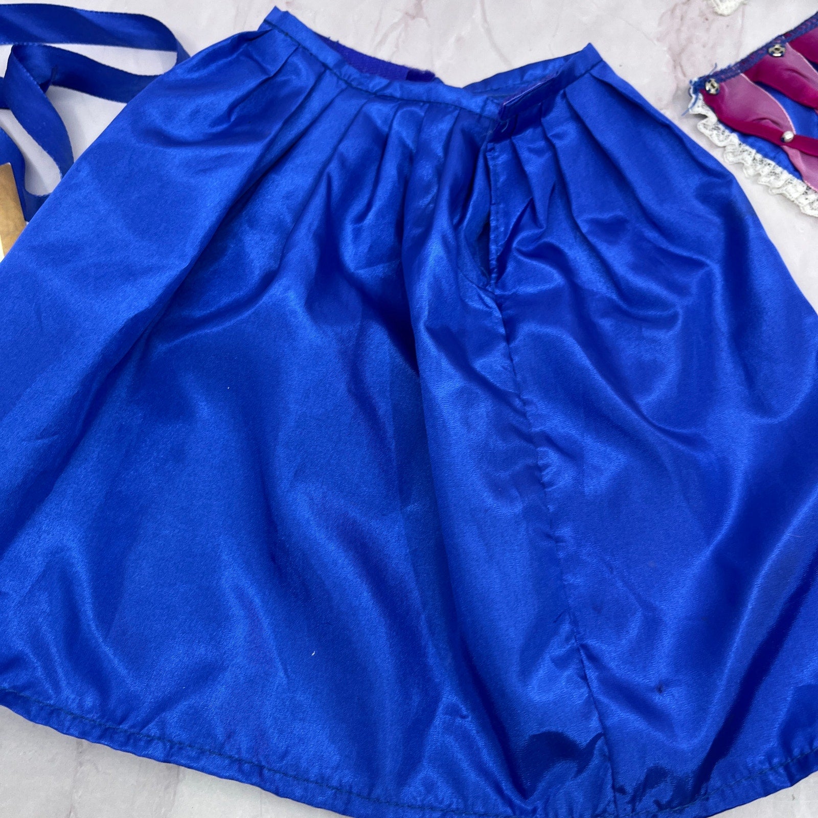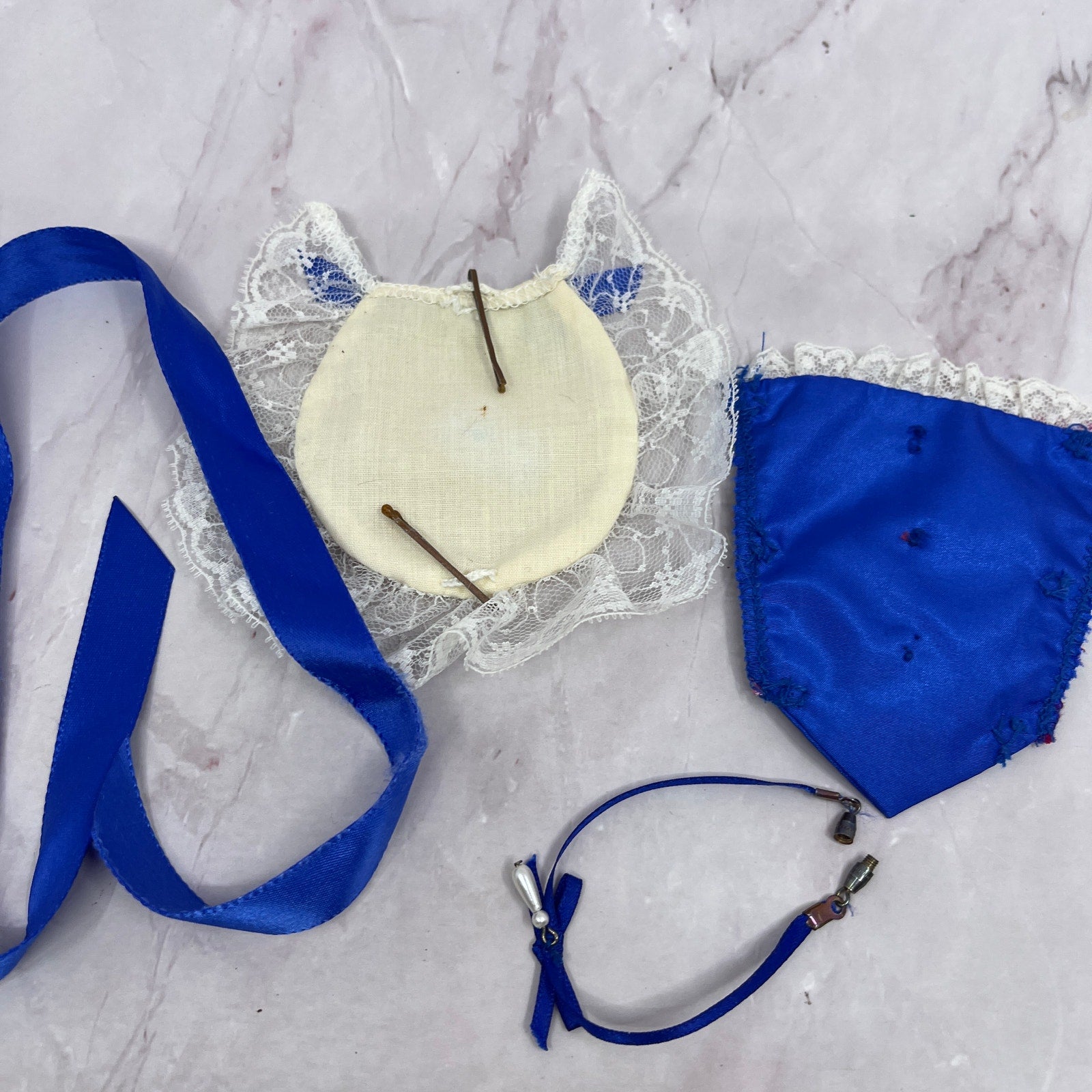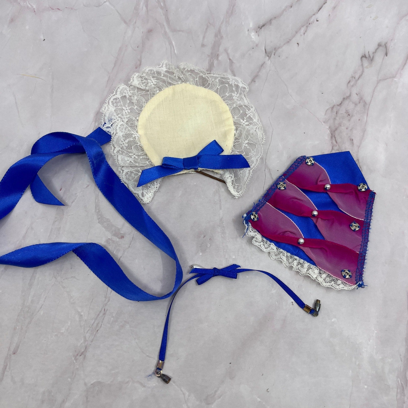 Felicity's blue dress, lace & ribboned stomachers, choker necklace, pettticoat, hair ribbon, piner cap, double-sided instruction sheet & mini christmas story booklet original 1993, overall good shape. See pics for condition.