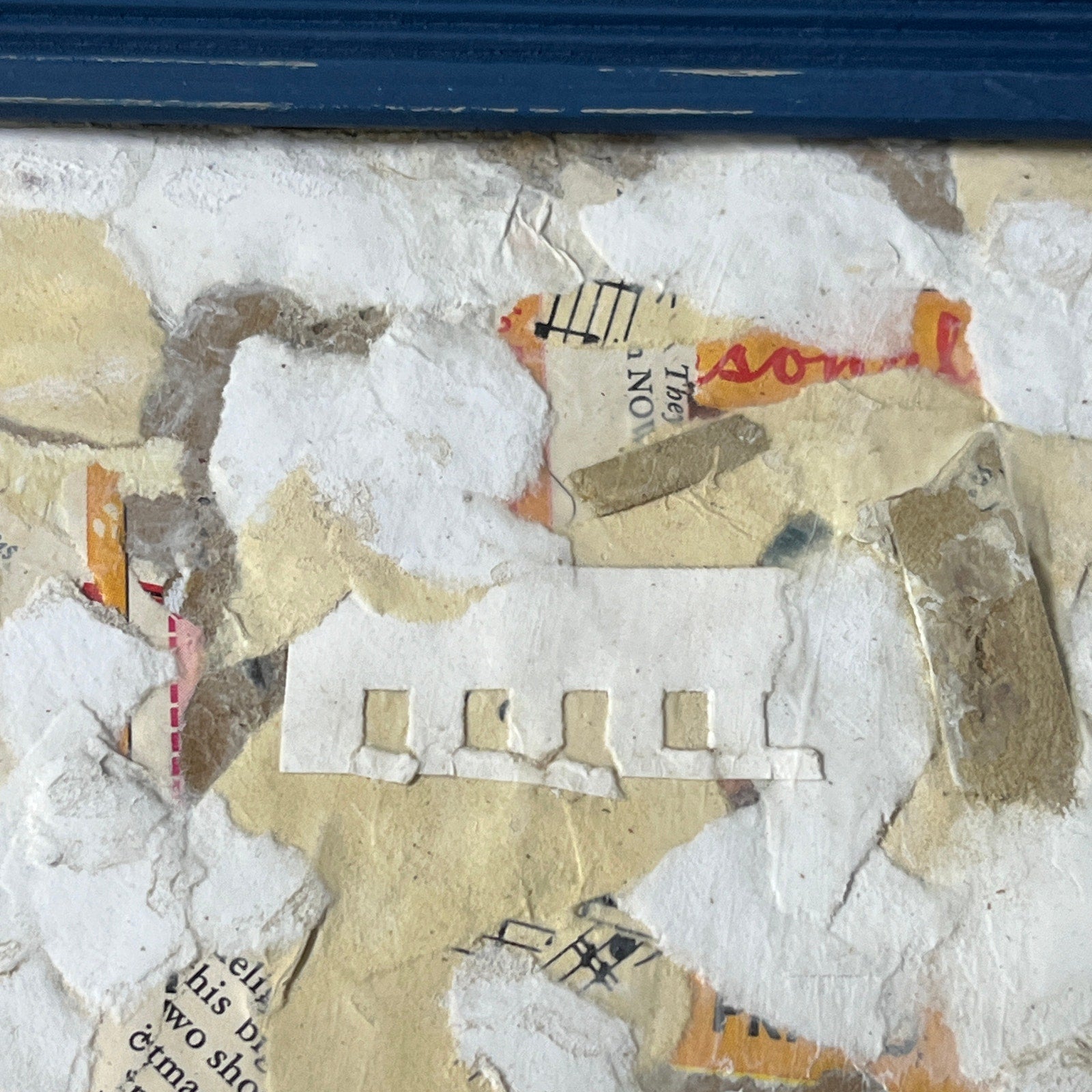 This piece is a collage made from vintage paper, and is framed in a vintage frame. This is an original collage painting by abstract artist Sam Lewis. This is a great and affordable way to own a piece of original art and add a pop of color to your space. Also a great gift idea. Ready to hang.