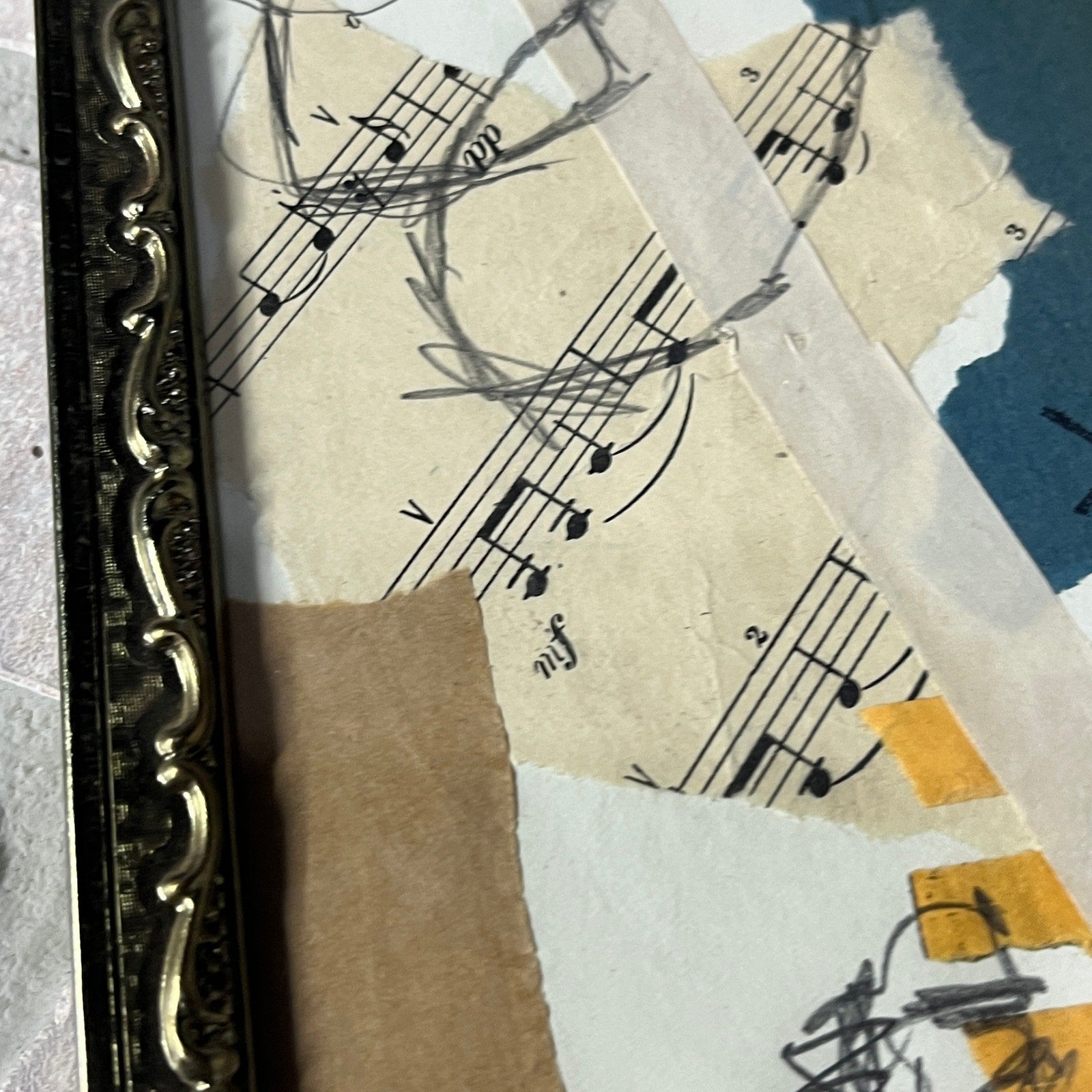 This piece is a collage made from original vintage paper, and is framed in a vintage frame. This is an original collage painting by abstract artist Sam Lewis. This is a great and affordable way to own a piece of original art and add a pop of color to your space. Also a great gift idea. Meant to stand up on a desk or table.