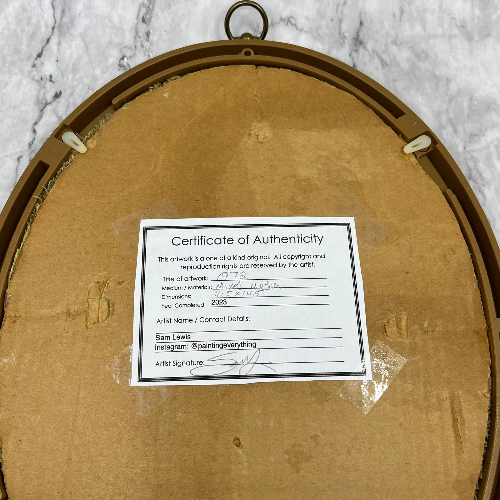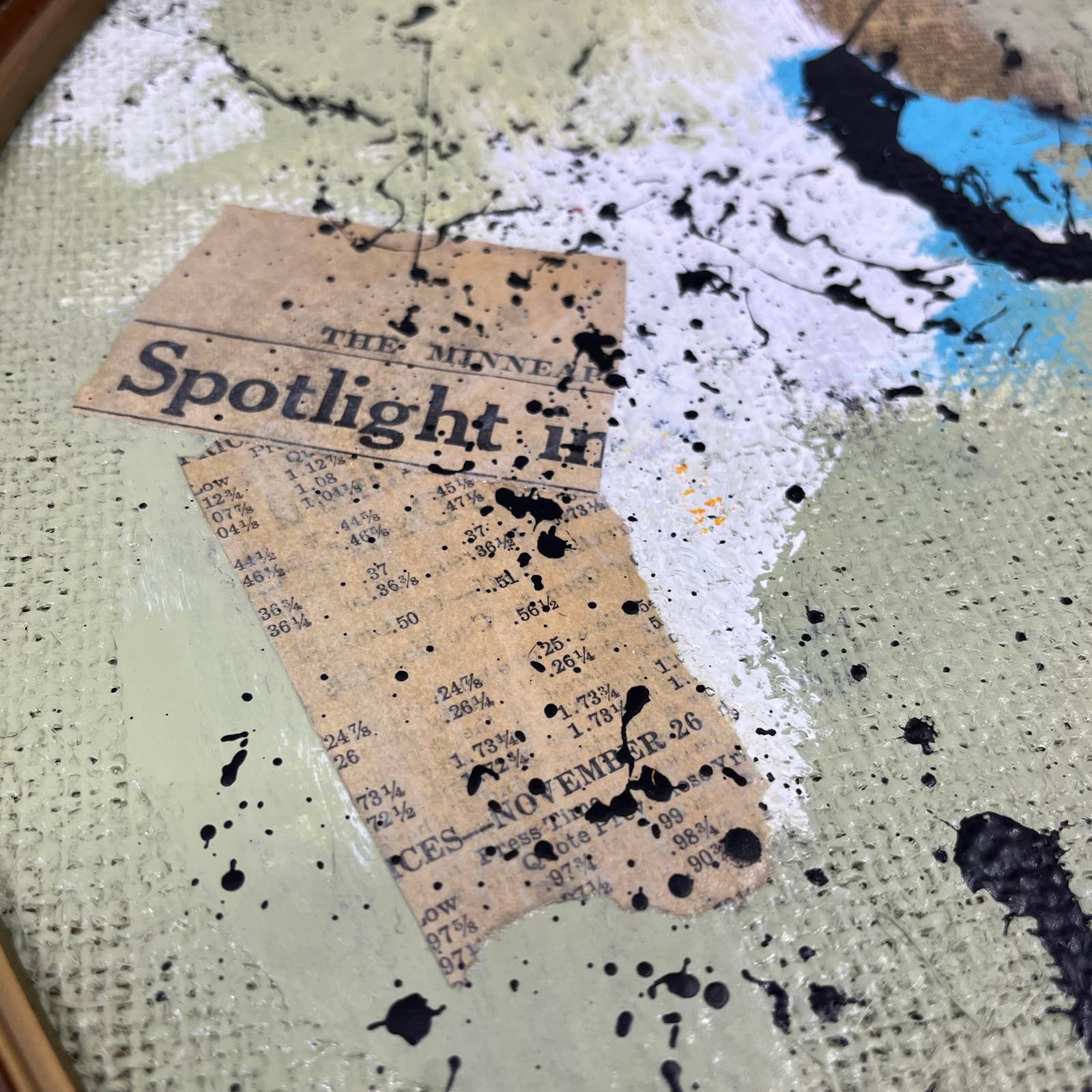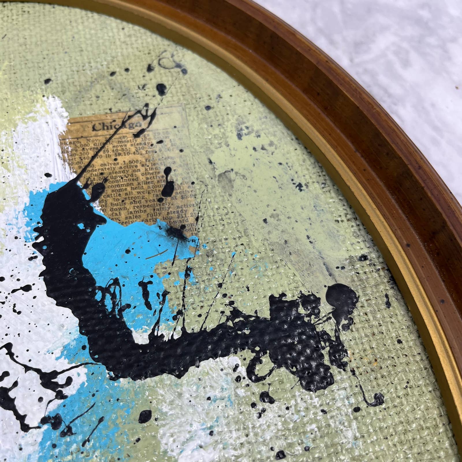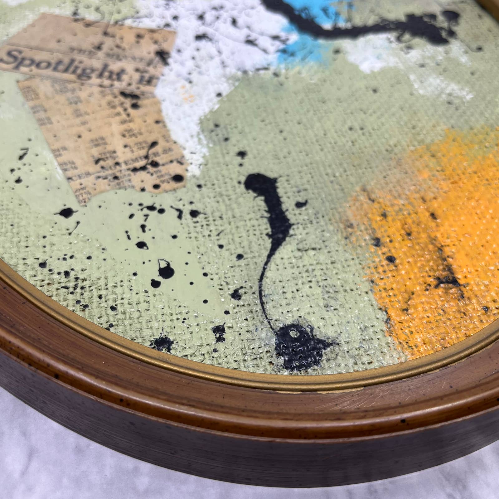 14.5x11.5" Abstract Art Painting. Original piece by artist Sam Lewis. Made from a reclaimed print with pieces of Newspaper dating to the 1930s. Frame is ready to hang. This is a great and affordable way to own a piece of original art and add a pop of color to your space. Also a great gift idea. Comes with signed COA certificate of authenticity.