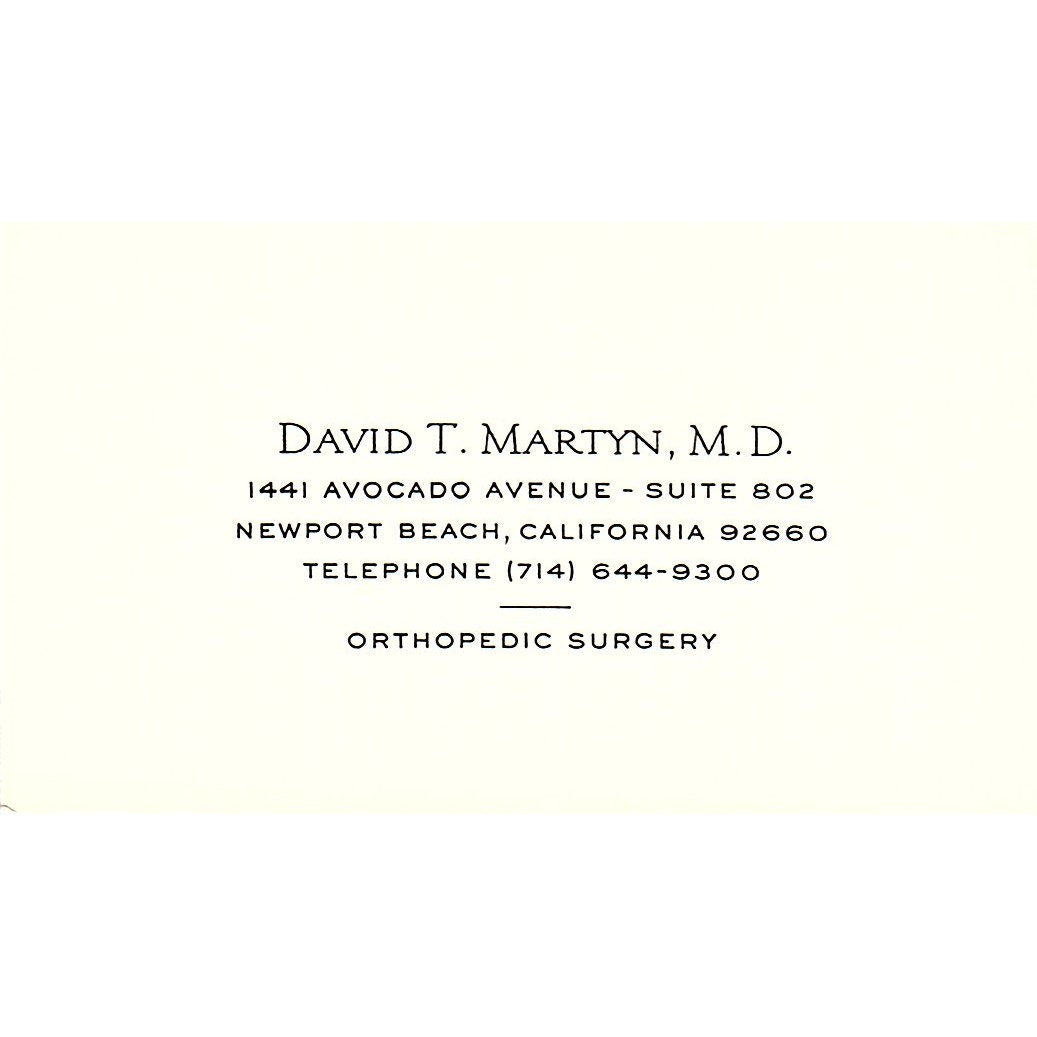 Orthopedic Surgery David T. Marty, M.D, Newport Bach, California Vintage Business Card SF3-B9