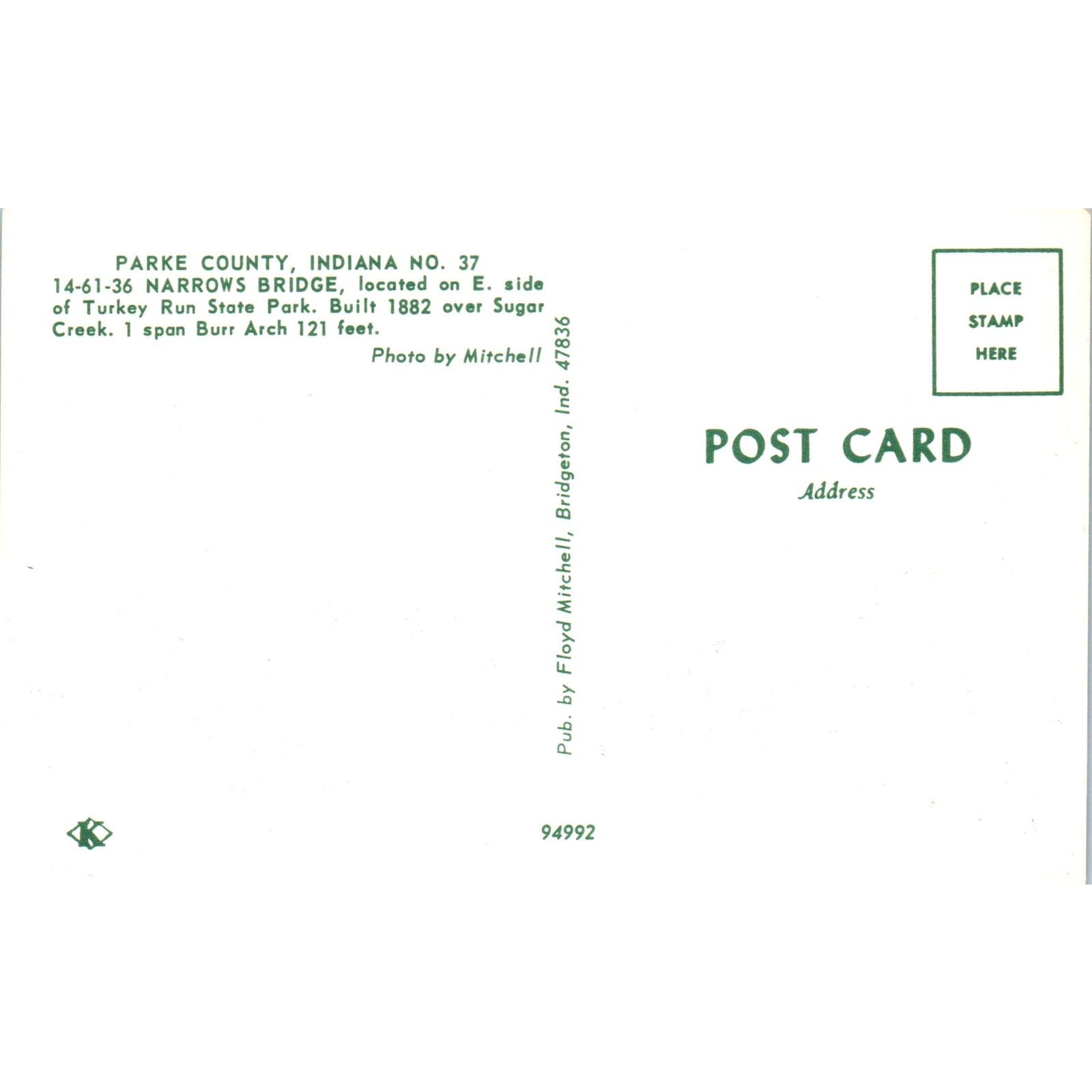 Parke County IN 37 Narrows Bridge Vintage Covered Bridge Postcard PD1