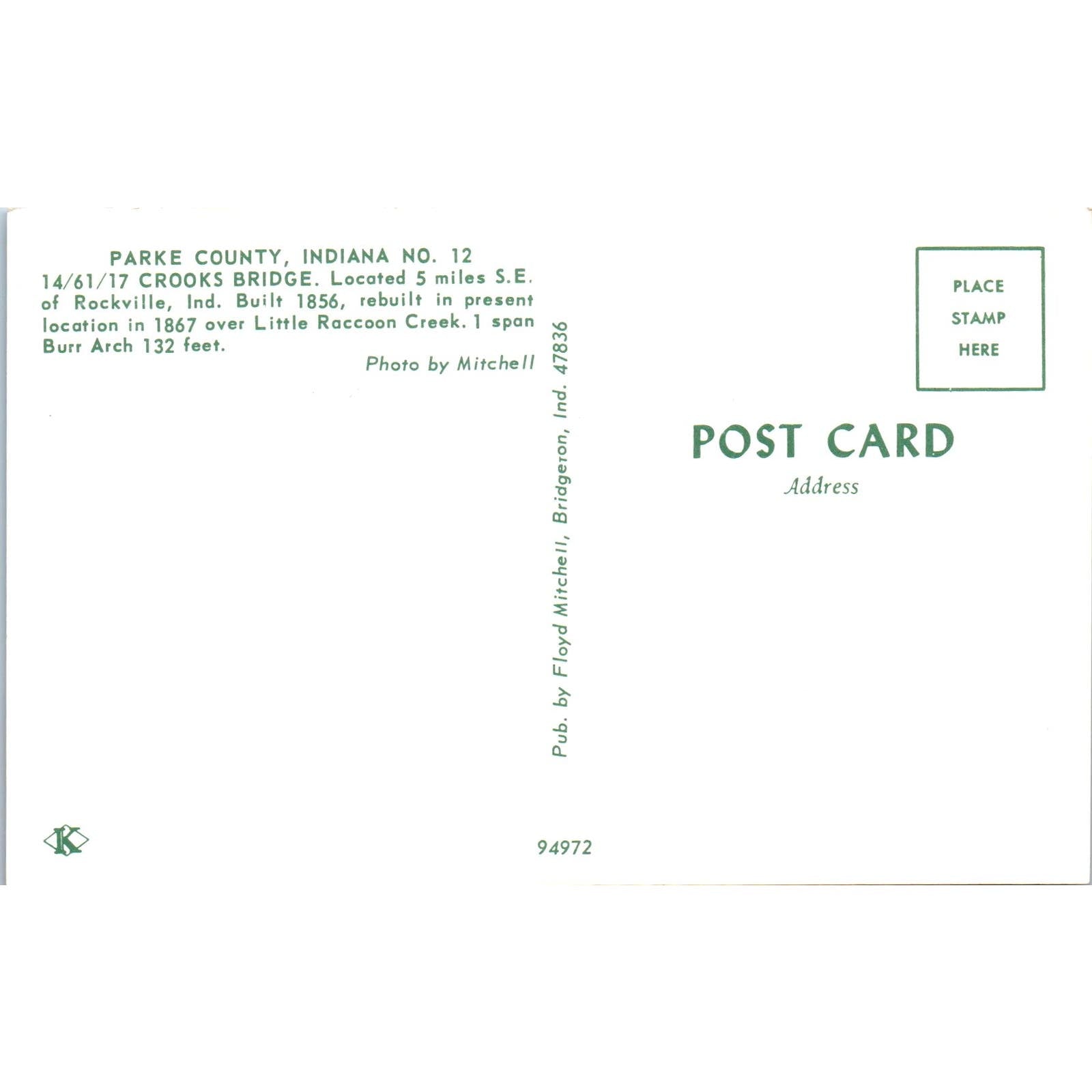 Parke County No 12 Crooks Bridge Rockville Vintage Covered Bridge Postcard PD3