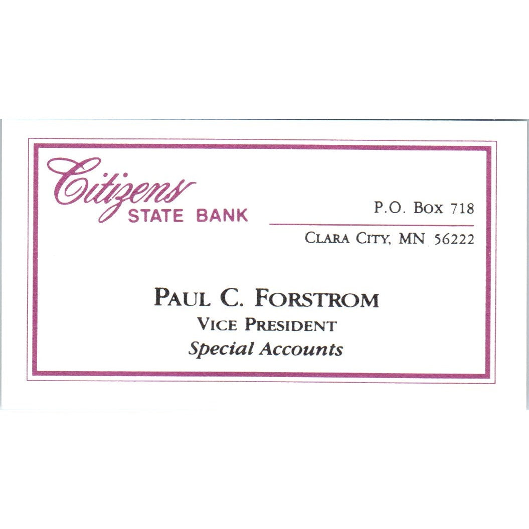 Paul C Forstrom Citizens State Bank Clara City MN Vintage Business Card SD8-B19
