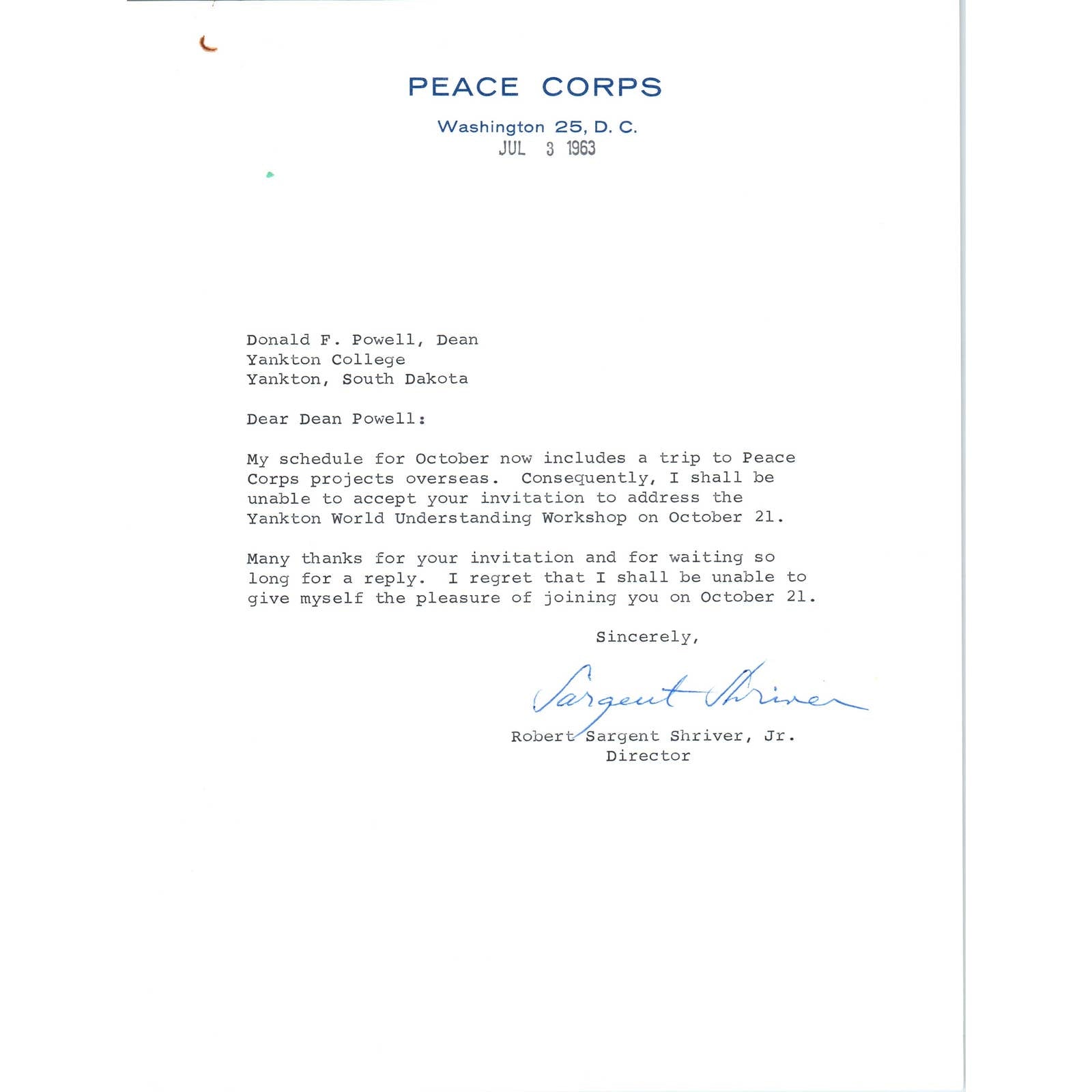 Peace Corps Official Letterhead Signed Robert Sargent Shriver, Jr 1963 TK1-P6