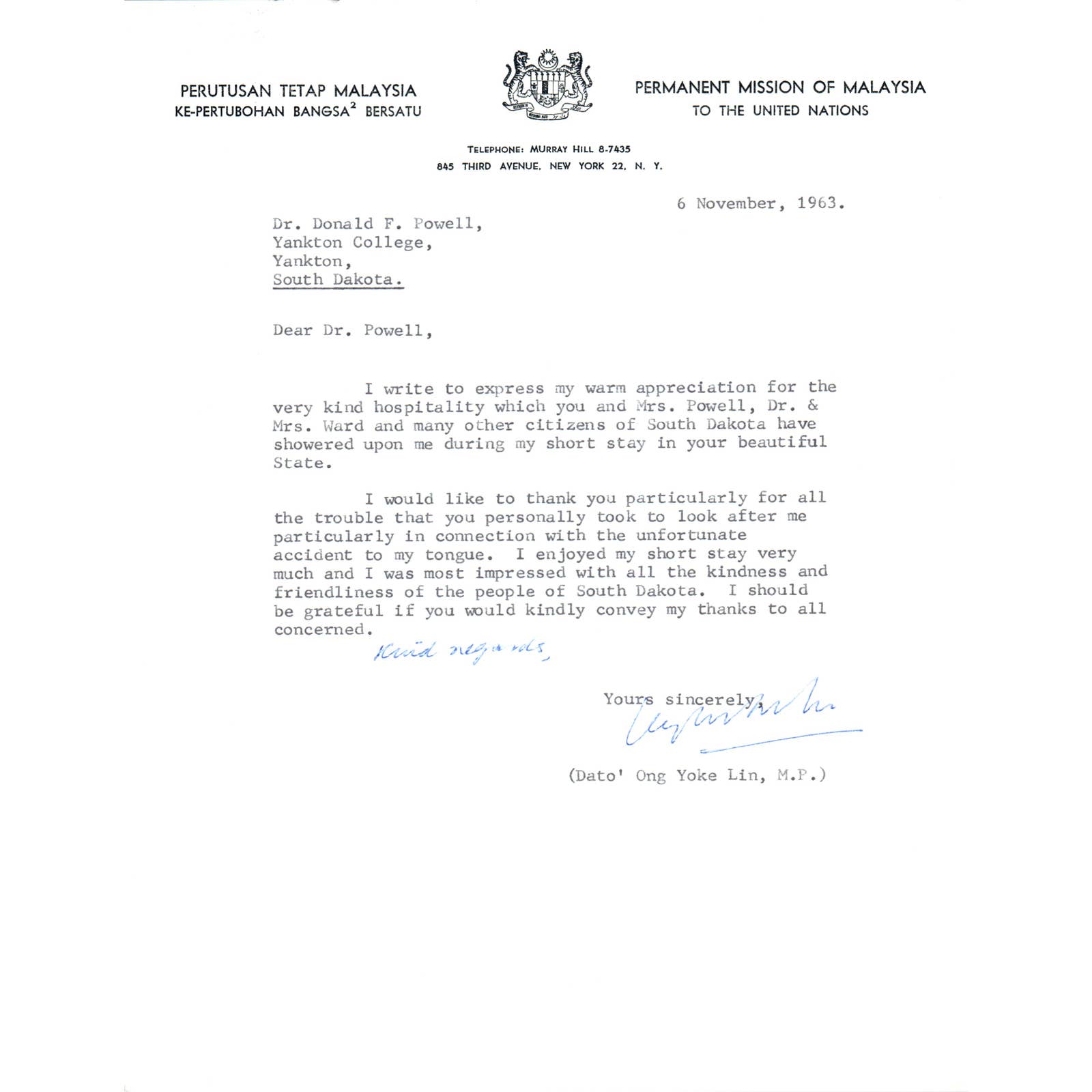Permanent Mission of Malaysia to the UN Letterhead Memo 11/6/63 TK1-P9