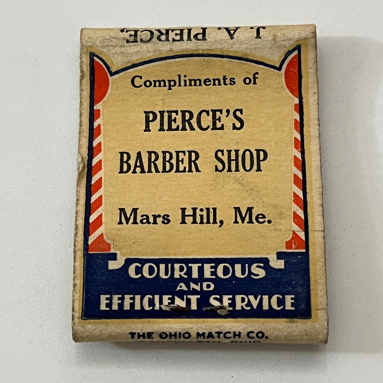 Pierce's Cafe, Barber Shop Mars Hill Maine Vintage Matchbook Cover TB8-MB2-10