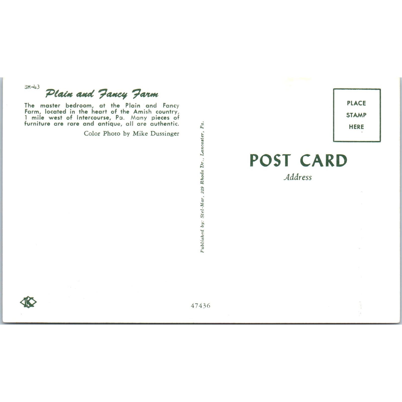Plain and Fancy Farm Master Bedroom Intercourse PA Original Postcard PB5