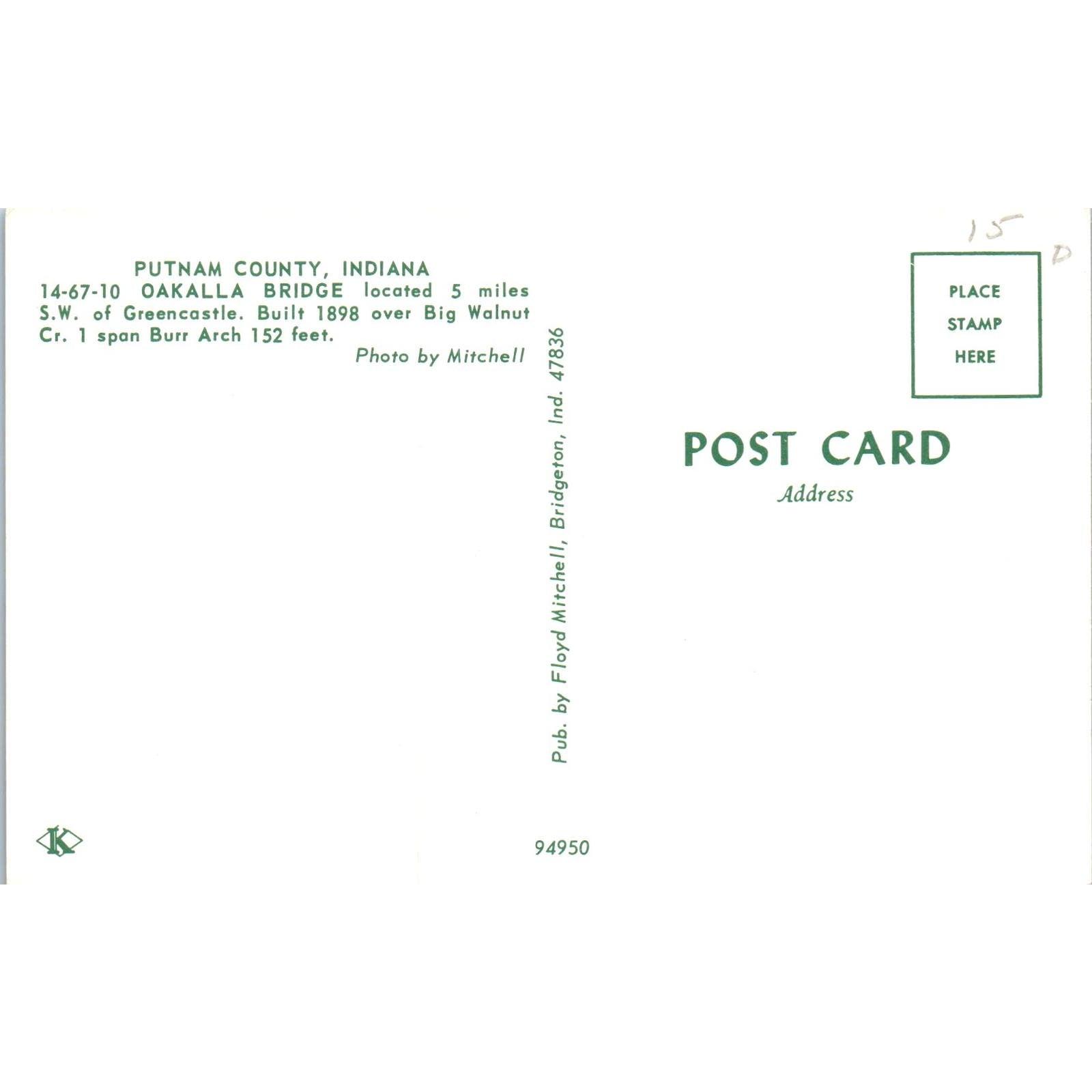 Putnam County Oakalla Bridge Indiana Covered Bridge Postcard PC8