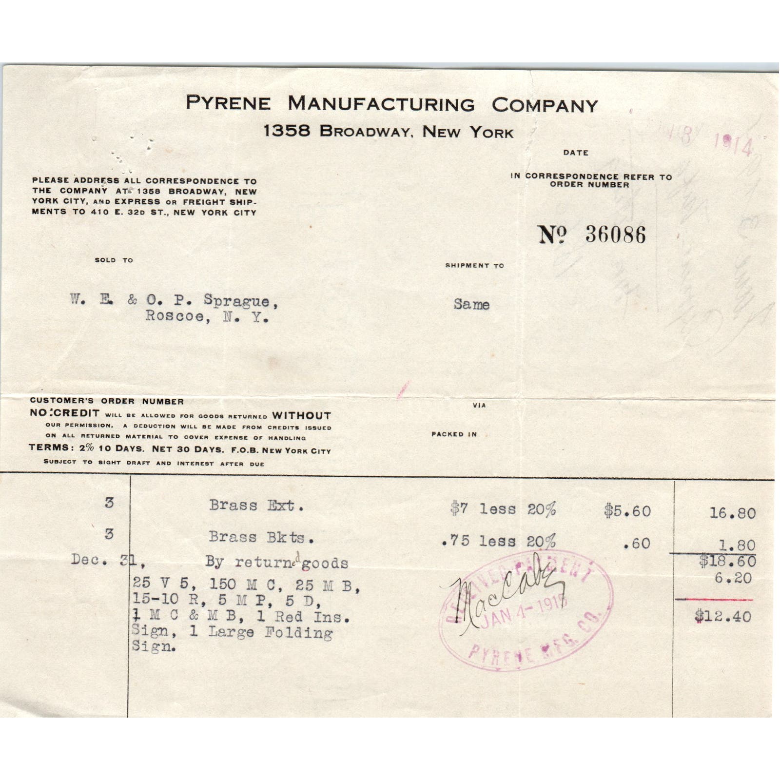 Pyrene Manufacturing Co NY 1915 Original Billhead Letterhead Receipt D8-LL