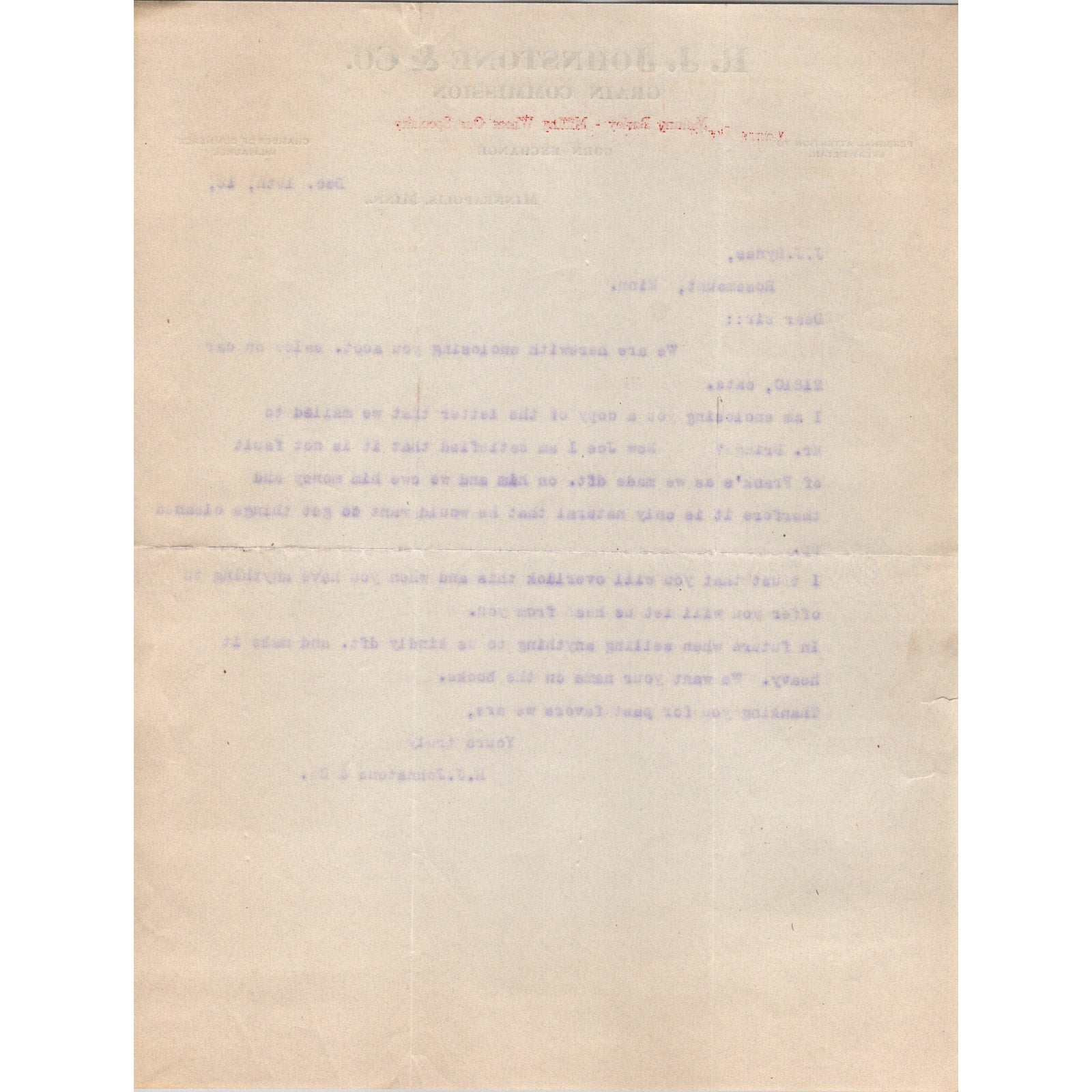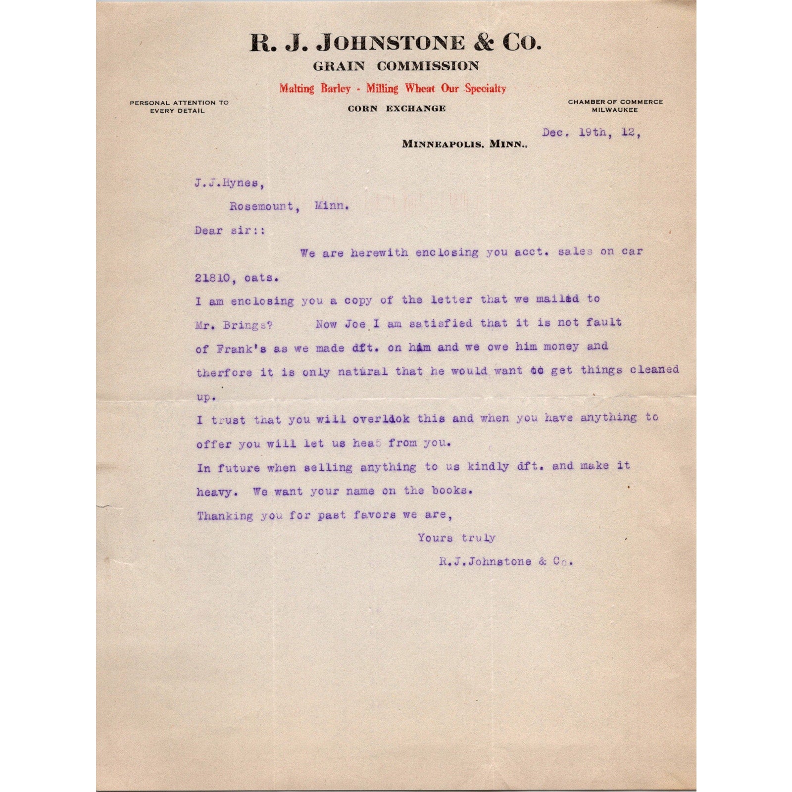 R.J. Johnstone & Co Grain Commission Minneapolis MN 1912 Letterhead Billhead K24