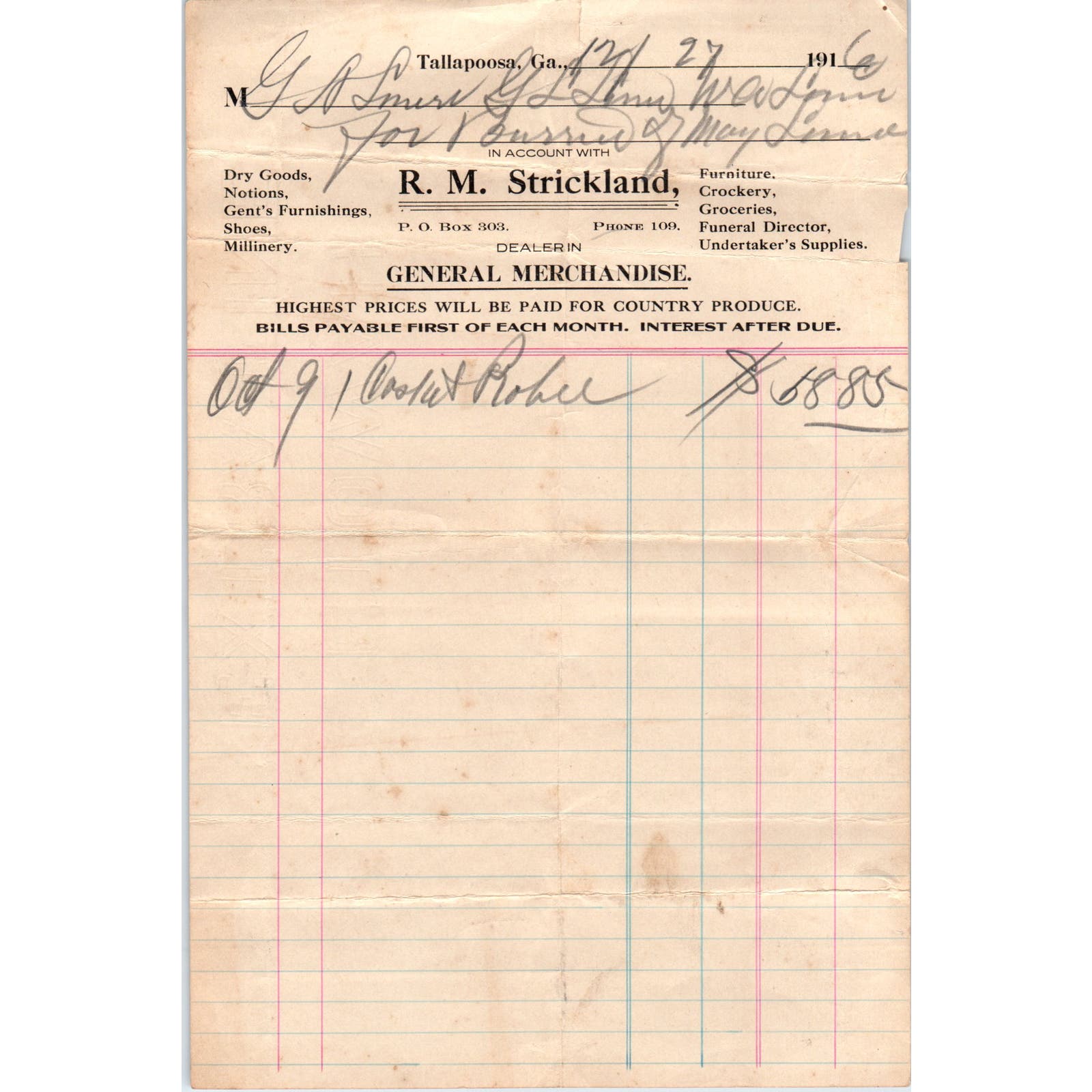 R.M. Strickland General Merchandise Tallapoosa GA 1916 Original Billhead D8-LL