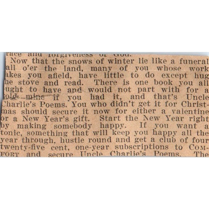 This is a SMALL ad, it measures approx 1/2x2. If you need an exact measurement please ask. Original piece pulled from the Jan 1910 Comfort Magazine. As this piece is over 100 years old, there are some staining and signs of wear and tear. See pics for condition.