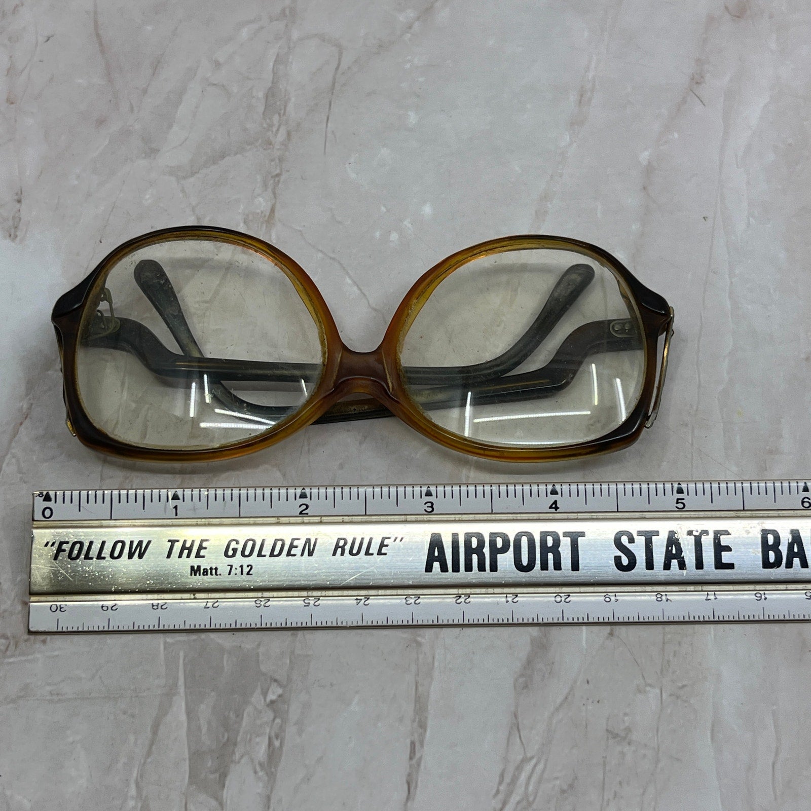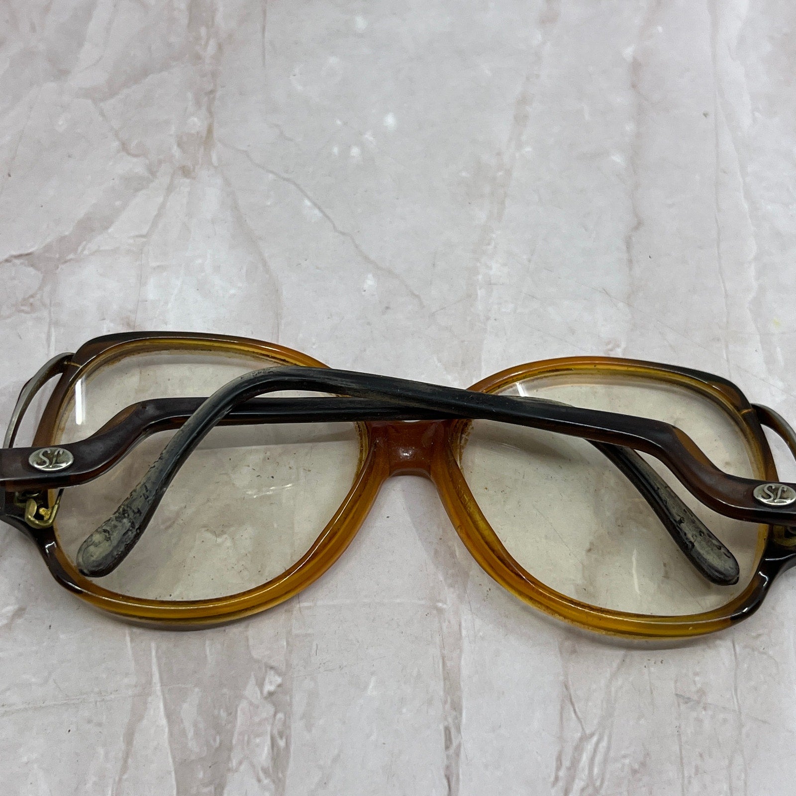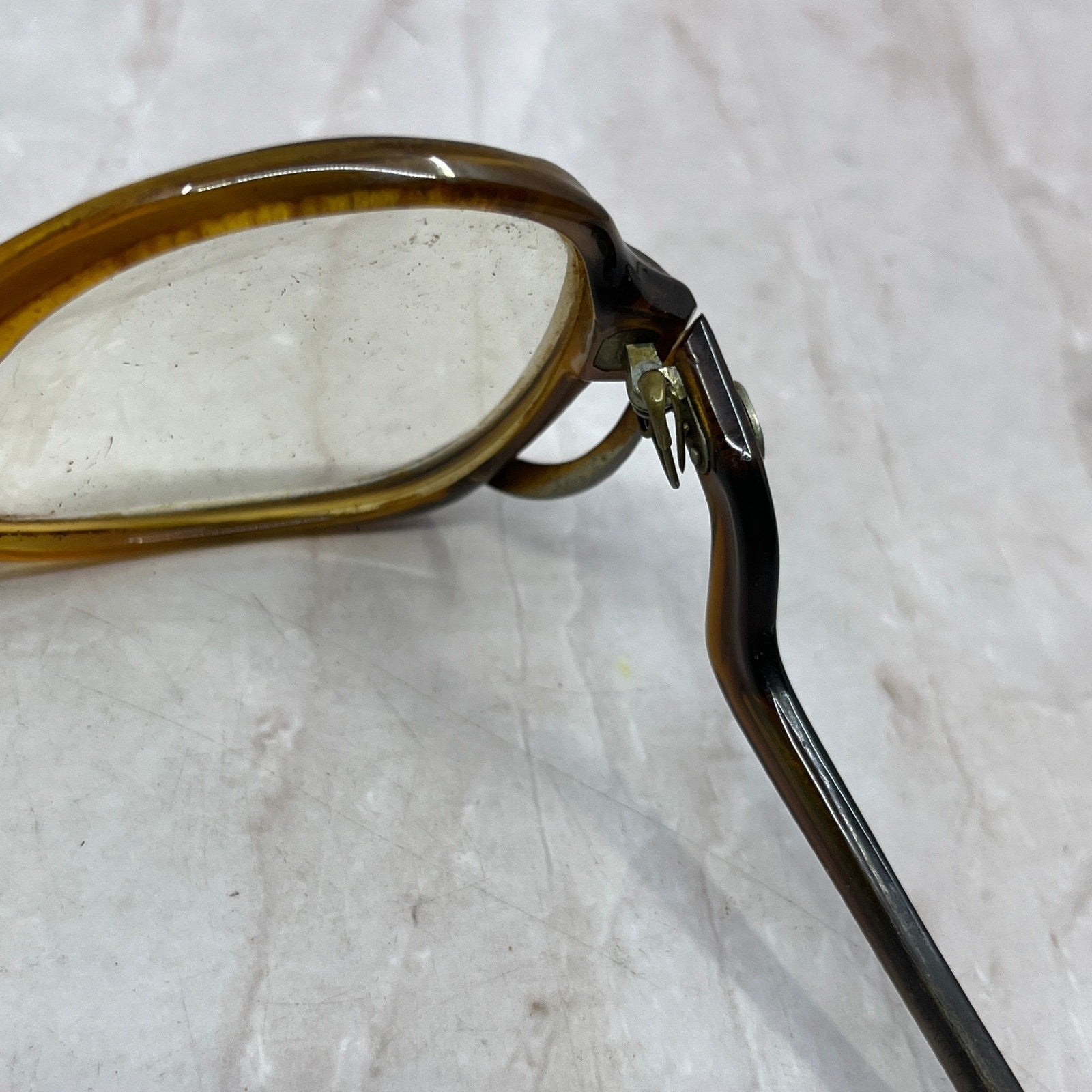 Please note one arm is missing a screw and currently is held on with a safety pin. FRAMES ONLY, NO LENSES. Please see pictures for measurements. These have prescription lenses, and you will need to replace them in order to use the glasses, these are being sold as FRAMES ONLY. They have various wear and tear from use, and could use a good cleaning - reflected in the price. See pics for condition.