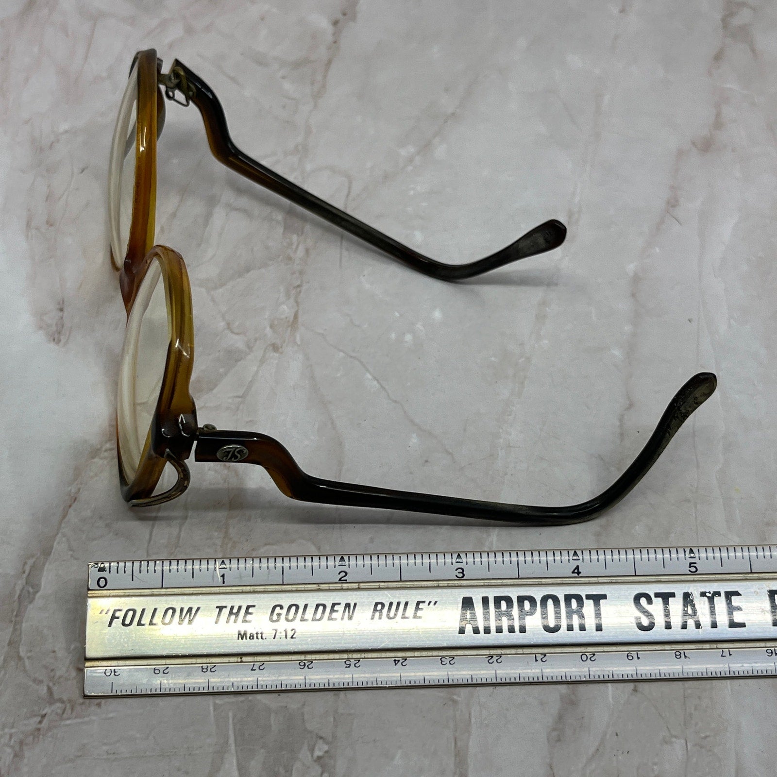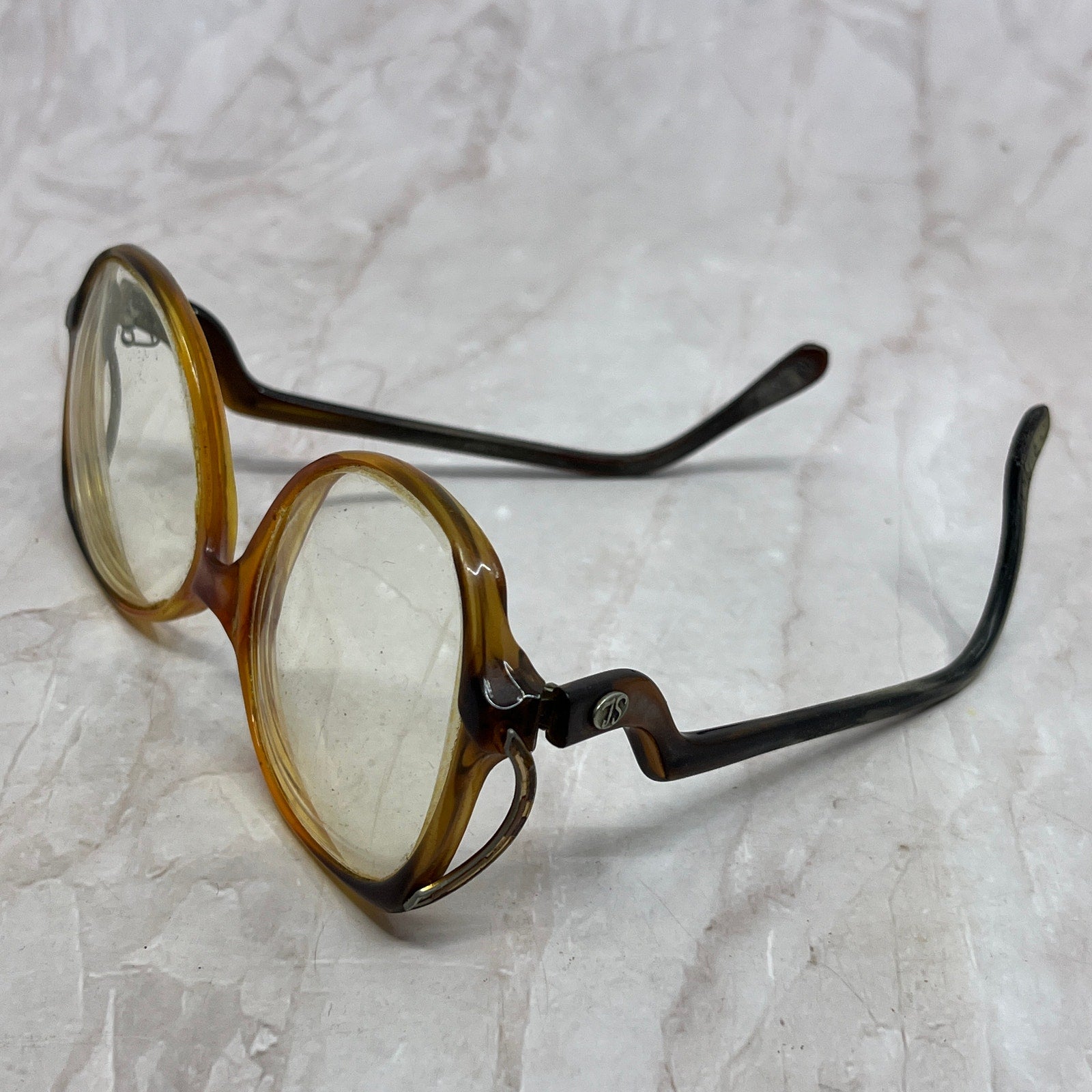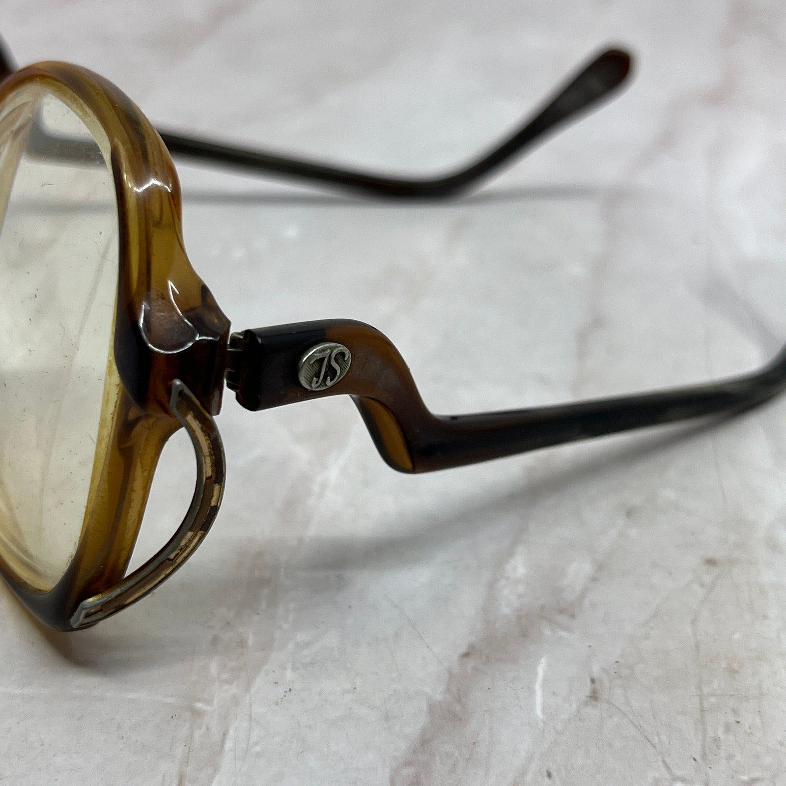 Please note one arm is missing a screw and currently is held on with a safety pin. FRAMES ONLY, NO LENSES. Please see pictures for measurements. These have prescription lenses, and you will need to replace them in order to use the glasses, these are being sold as FRAMES ONLY. They have various wear and tear from use, and could use a good cleaning - reflected in the price. See pics for condition.