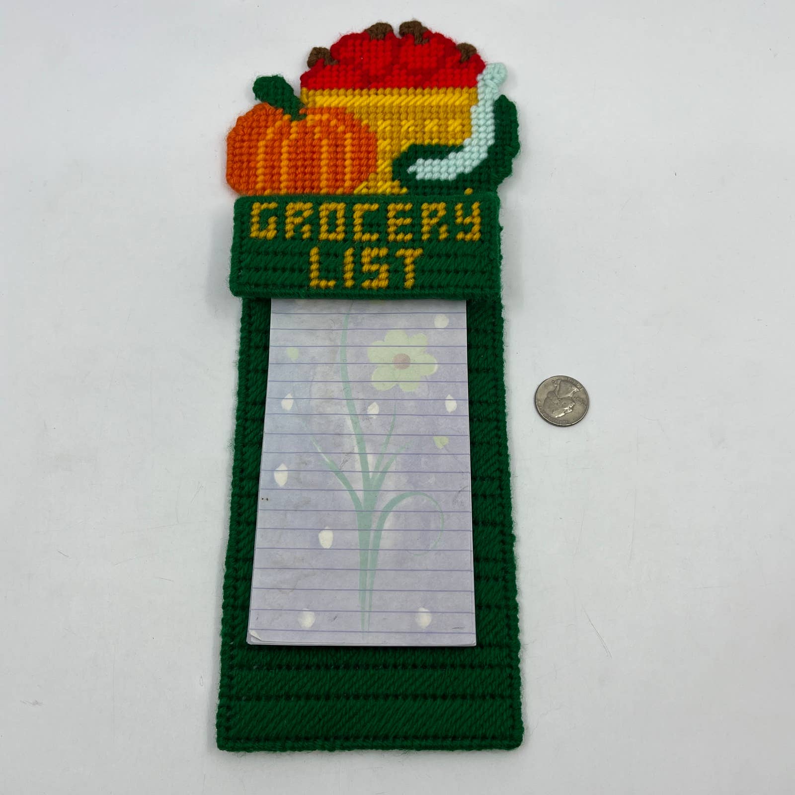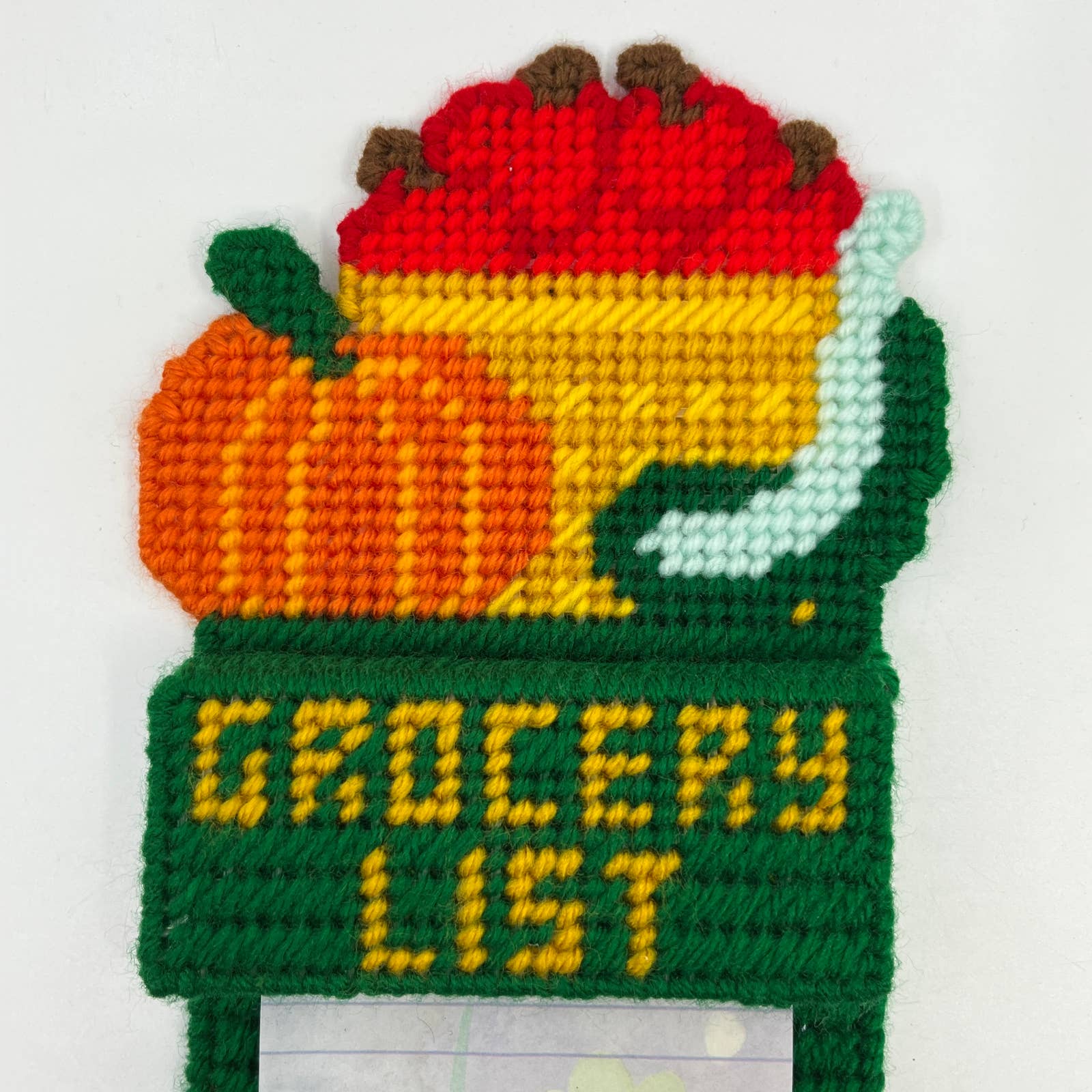 Retro Kitsch Cross Stitch Canvas Grocery List Holder Magnet Autumn Pumpkin Apples TC3