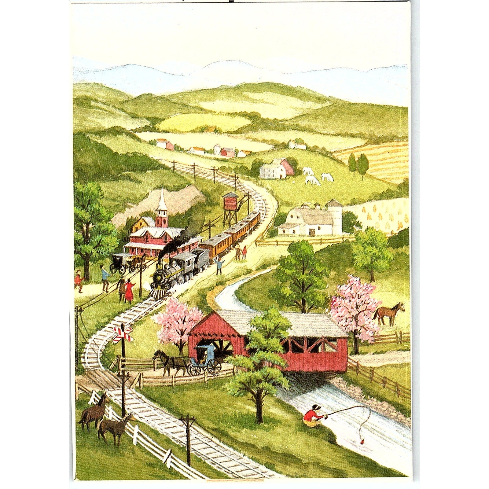 Retro Kitsch Folk Art Country Landscape Train Bridge Vintage Art Print 4x6 V12