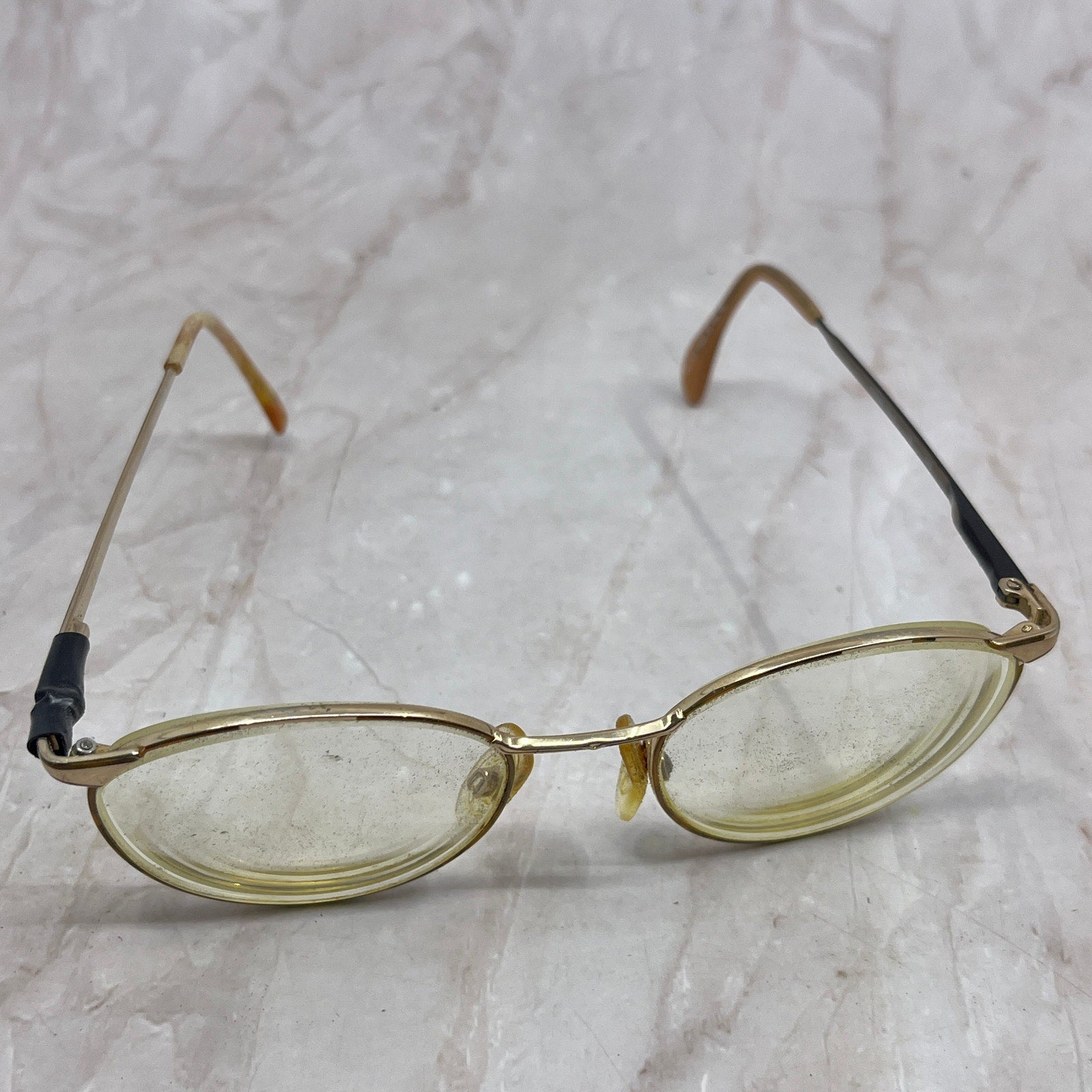 One arm is taped at the joint. FRAMES ONLY, NO LENSES. Please see pictures for measurements. These have prescription lenses, and you will need to replace them in order to use the glasses, these are being sold as FRAMES ONLY. They have various wear and tear from use, and could use a good cleaning - reflected in the price. See pics for condition.