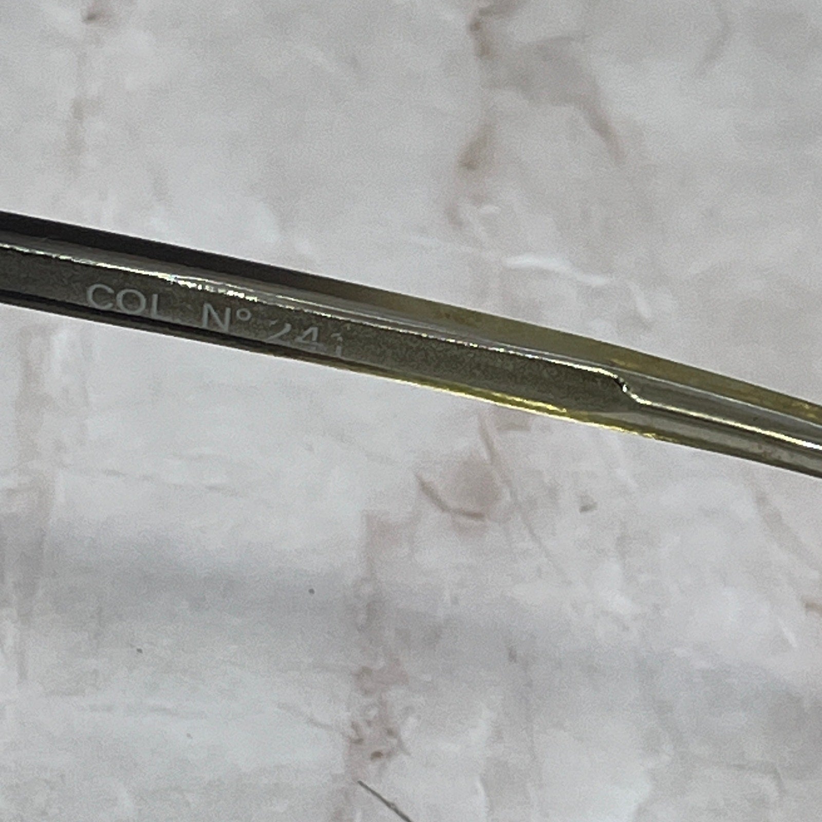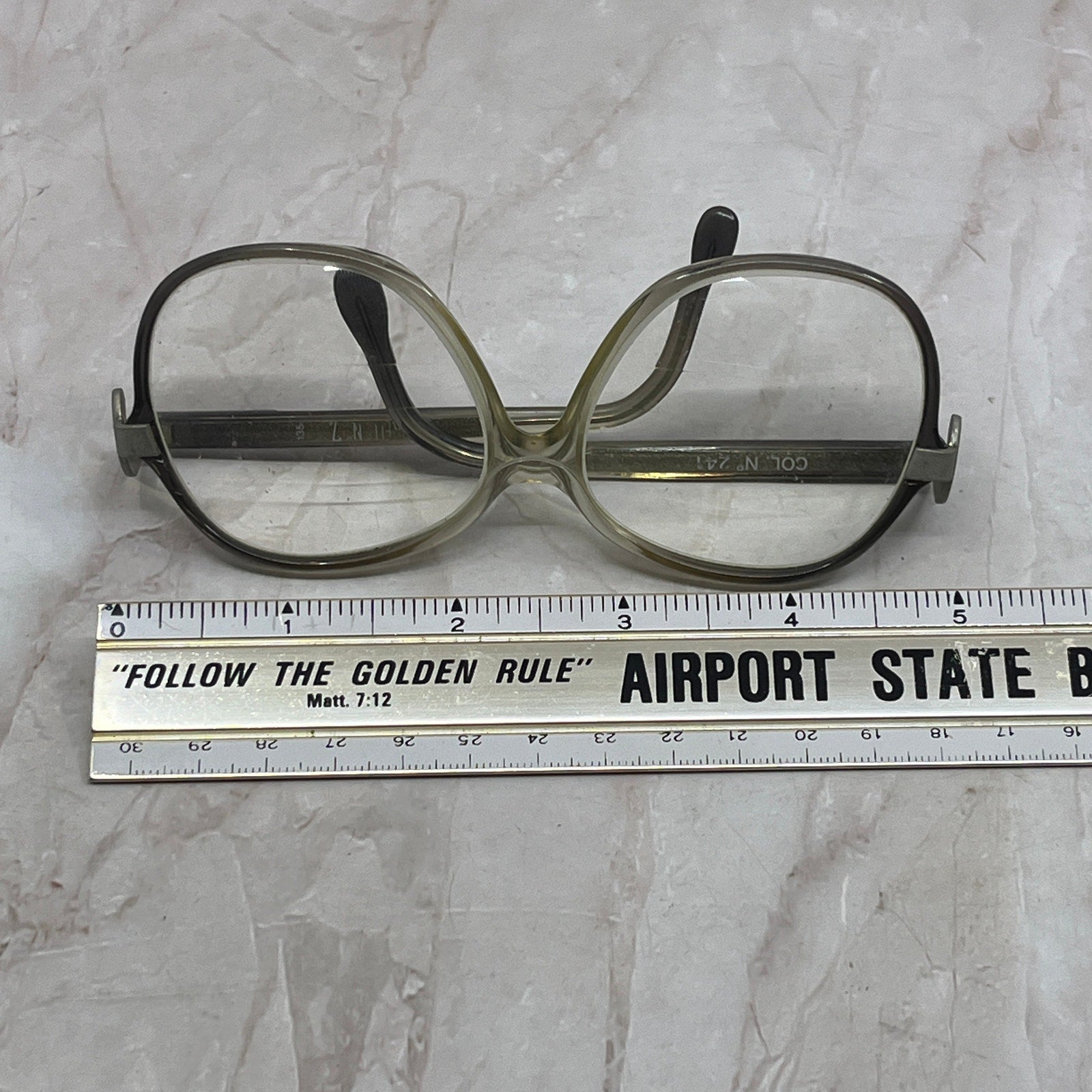 Please note one arm is missing a screw and currently is held on with a safety pin. FRAMES ONLY, NO LENSES. Please see pictures for measurements. These have prescription lenses, and you will need to replace them in order to use the glasses, these are being sold as FRAMES ONLY. They have various wear and tear from use, and could use a good cleaning - reflected in the price. See pics for condition.
