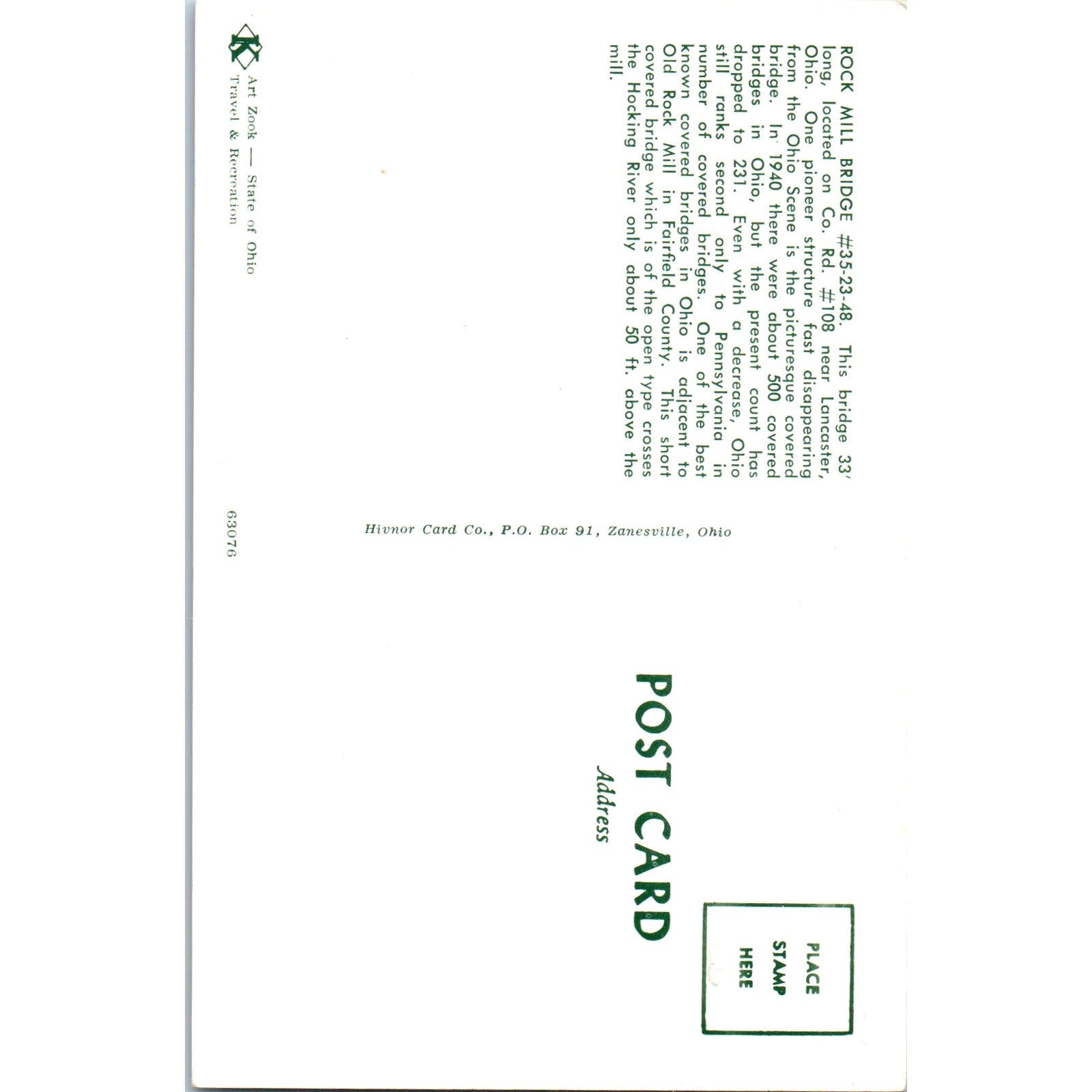 Rock Mill Bridge Lancaster Ohio Covered Bridge Postcard PC6