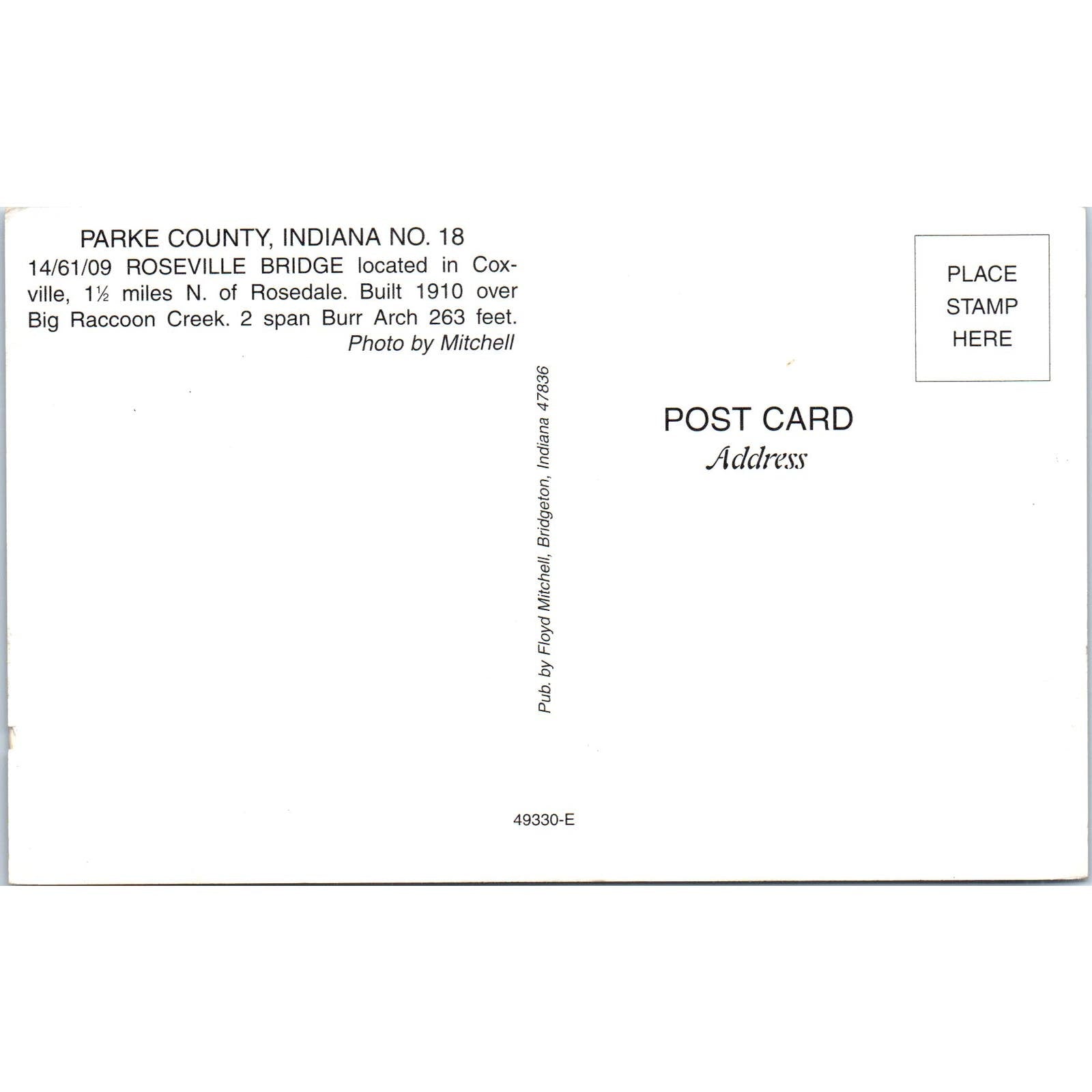 Roseville Bridge Parke County 18 IN Vintage Covered Bridge Postcard PC14
