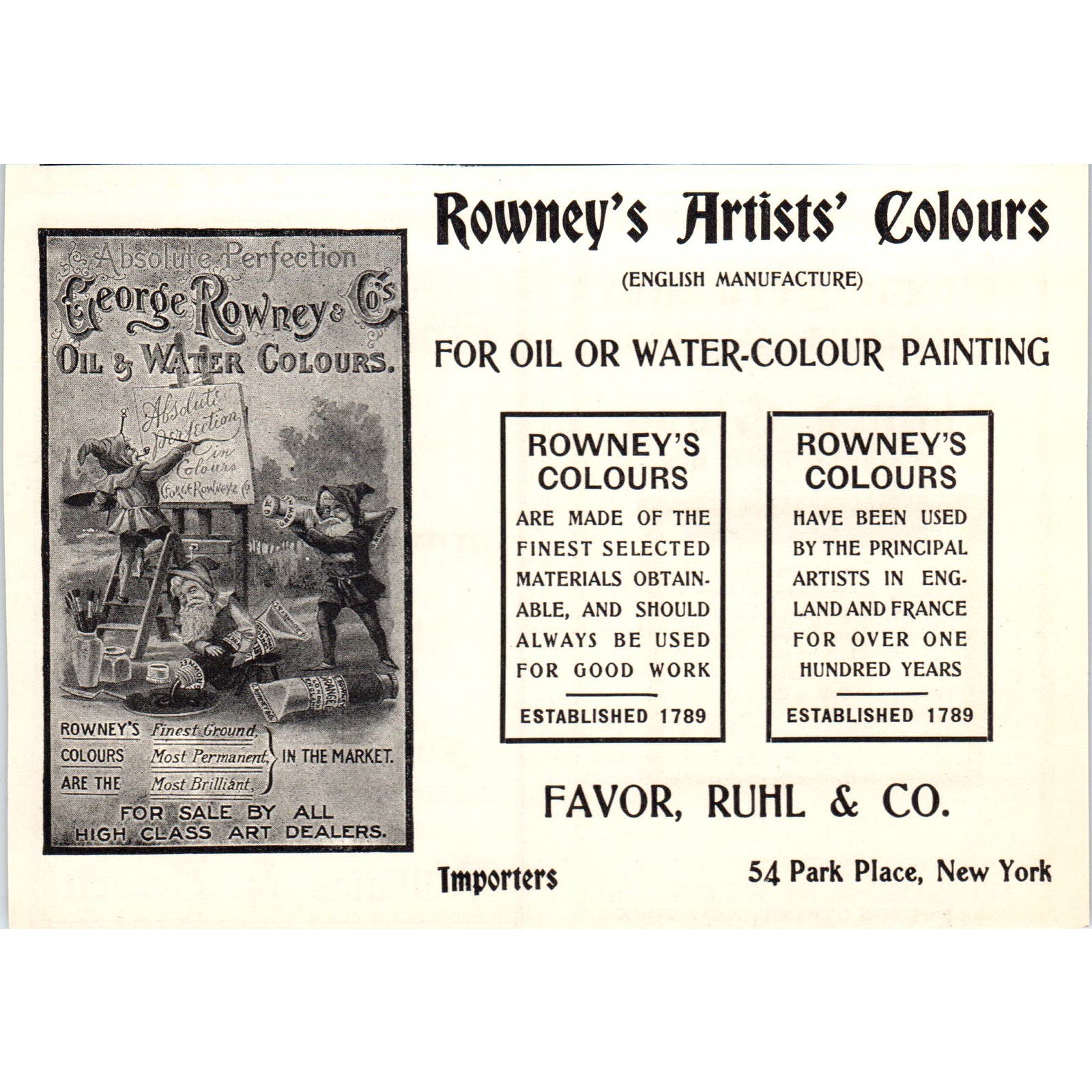 Rowney's Artists' Colours Favor, Ruhl & Co NY c1905 Victorian Ad AE9-MA3