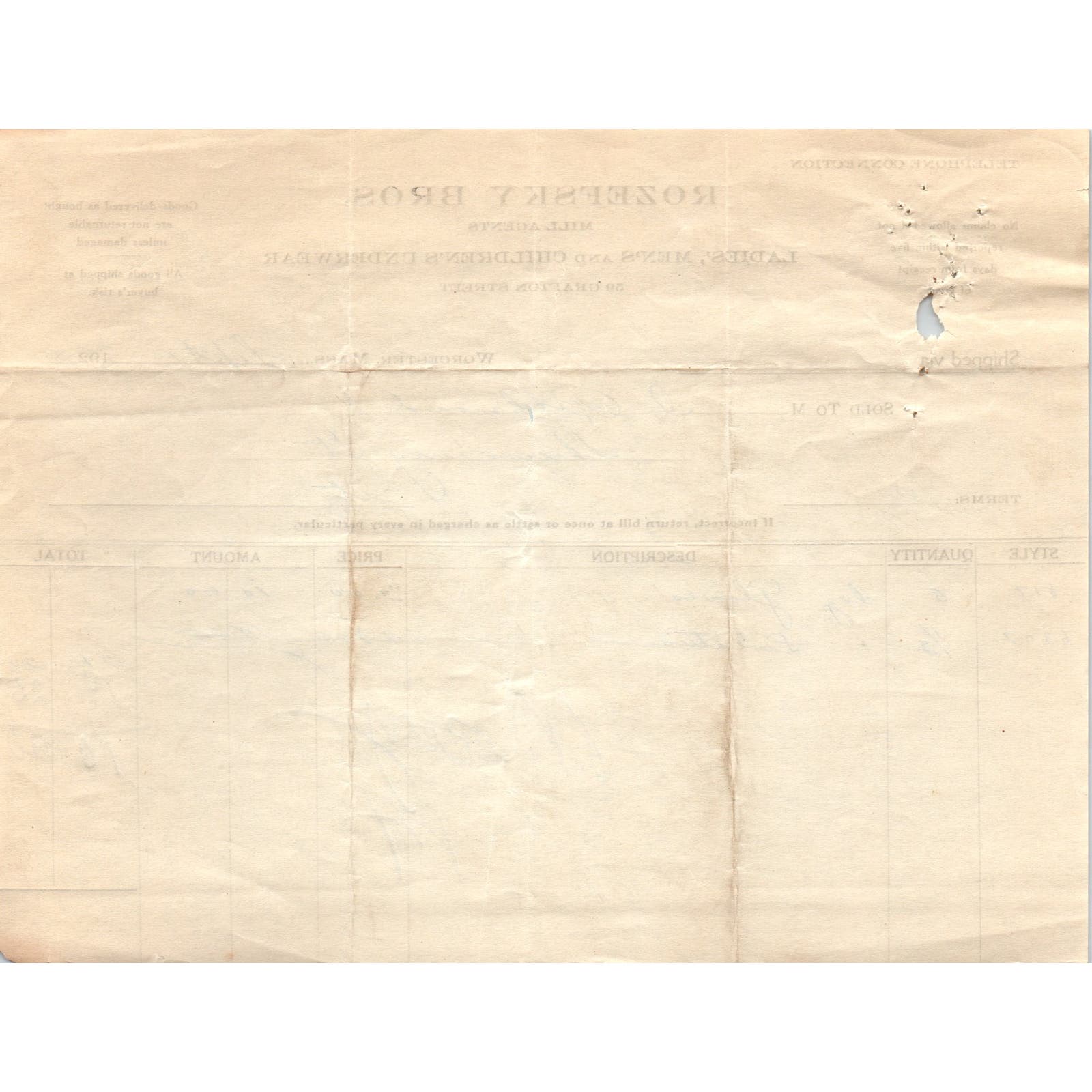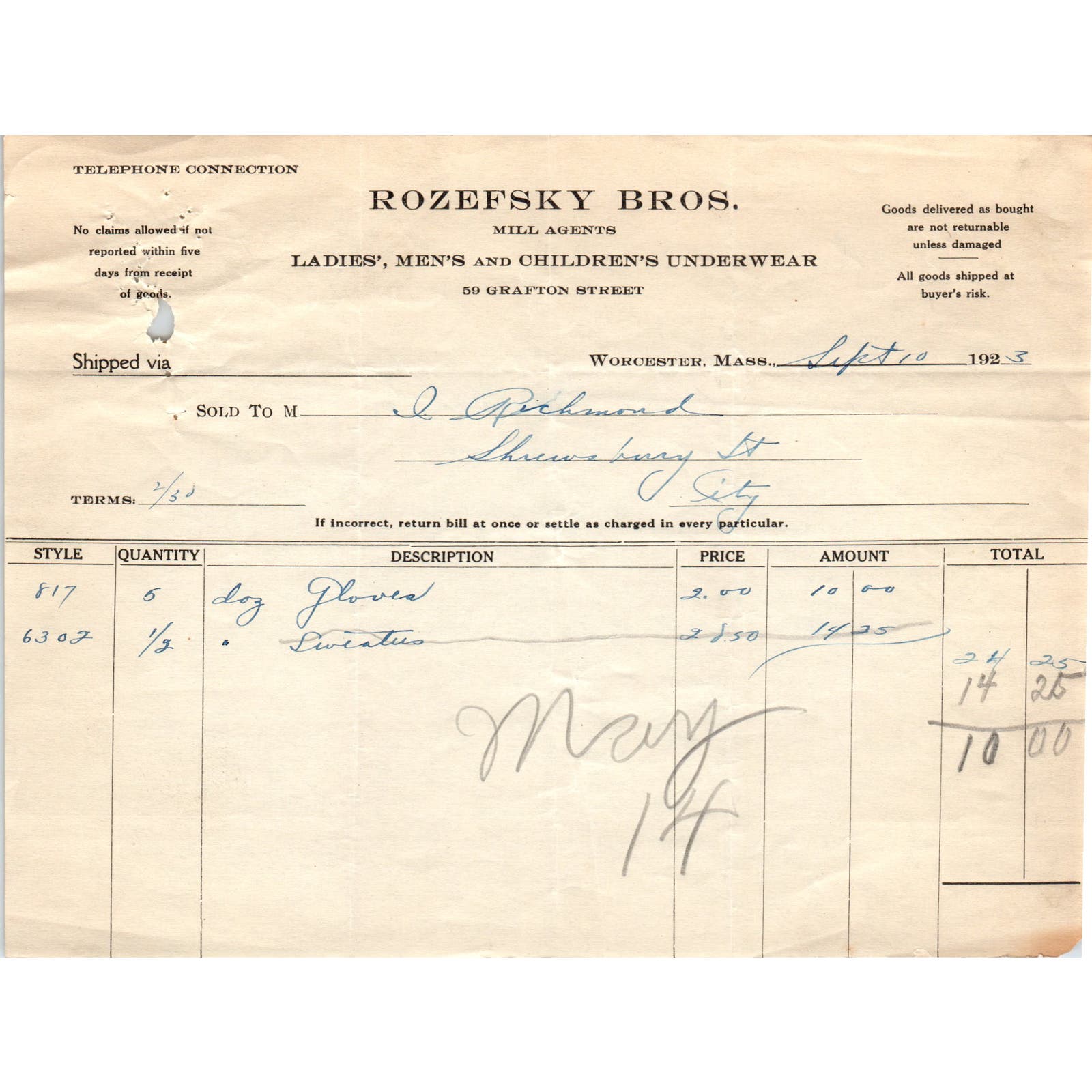 Rozefsky Bros Clothing Worcester 1923 Original Billhead Letterhead Receipt D8-LL