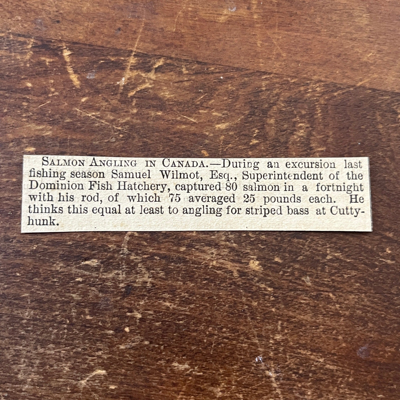 Samuel Wilmot Salmon Angling Canada Dominion Fish Hatchery Cuttyhunk 1878 Article AG2-S17