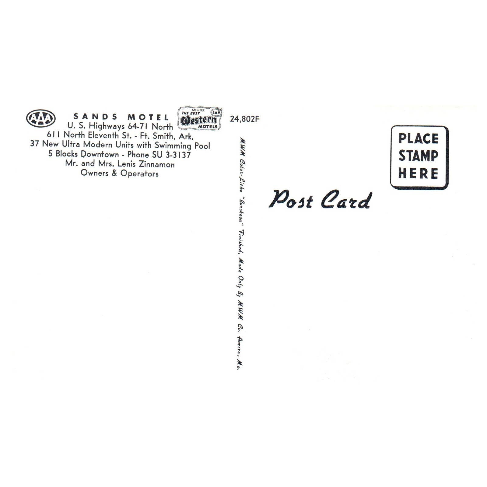 Sands Motel AAA Lenis Zinnamon Fort Smith Arkansas - Postcard TJ8-2